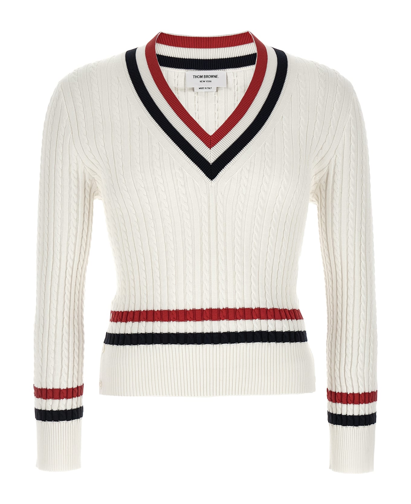 Braid cotton sweater with RWB tape inlays, V-neck, long sleeves with button cuffs and RWB grosgrain tape inside, side slits with buttons and inner grosgrain RWB tape. Composition: 100% cotton