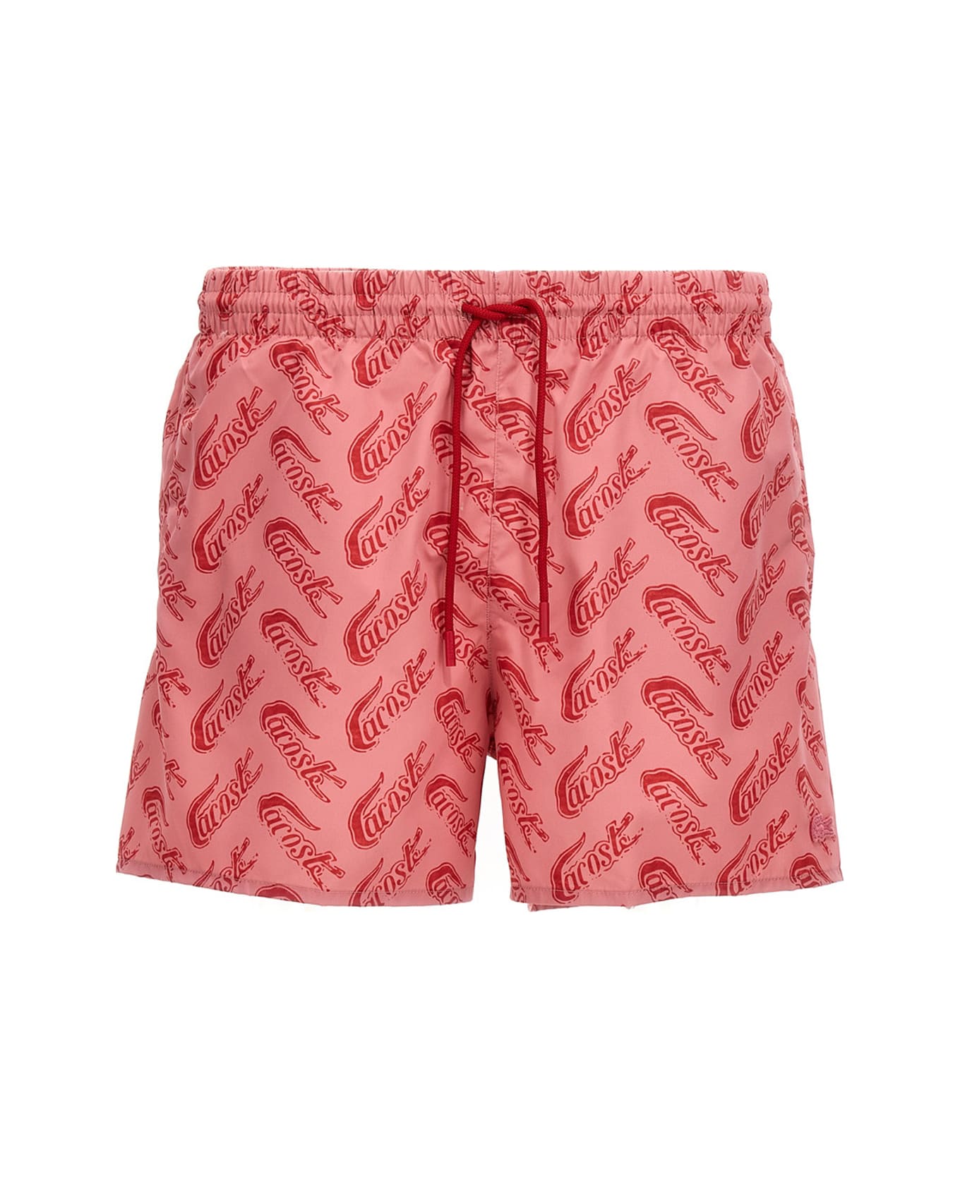 Quick dry tech fabric swimsuit with all-over logo print, logo patch, an elastic and drawstring at the waist, pockets and inner mesh briefs. : This product is made in recycled polyester. Composition: