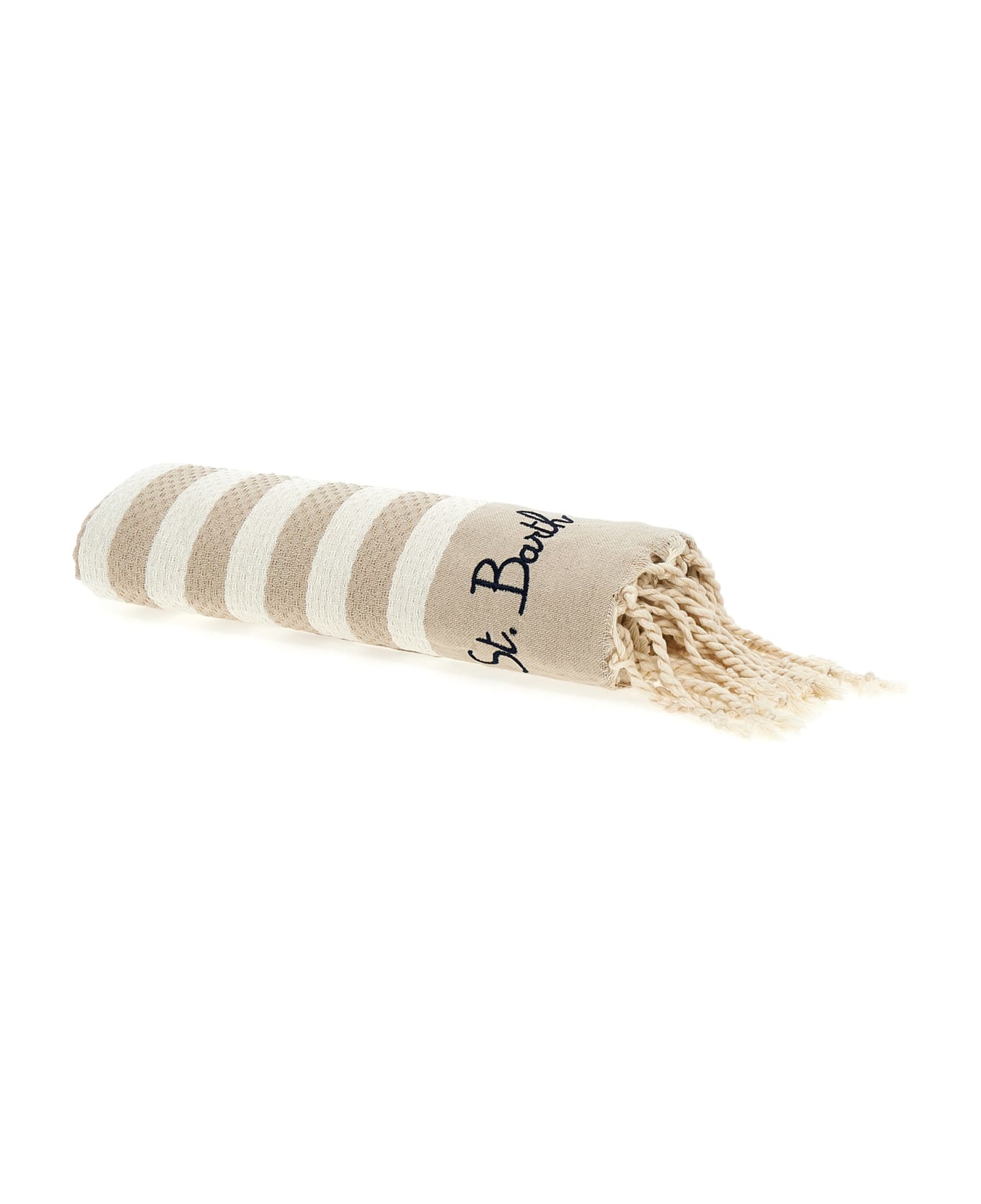 Striped cotton beach towel with fringes at the edges and logo embroidery. Composition: 100% cotton