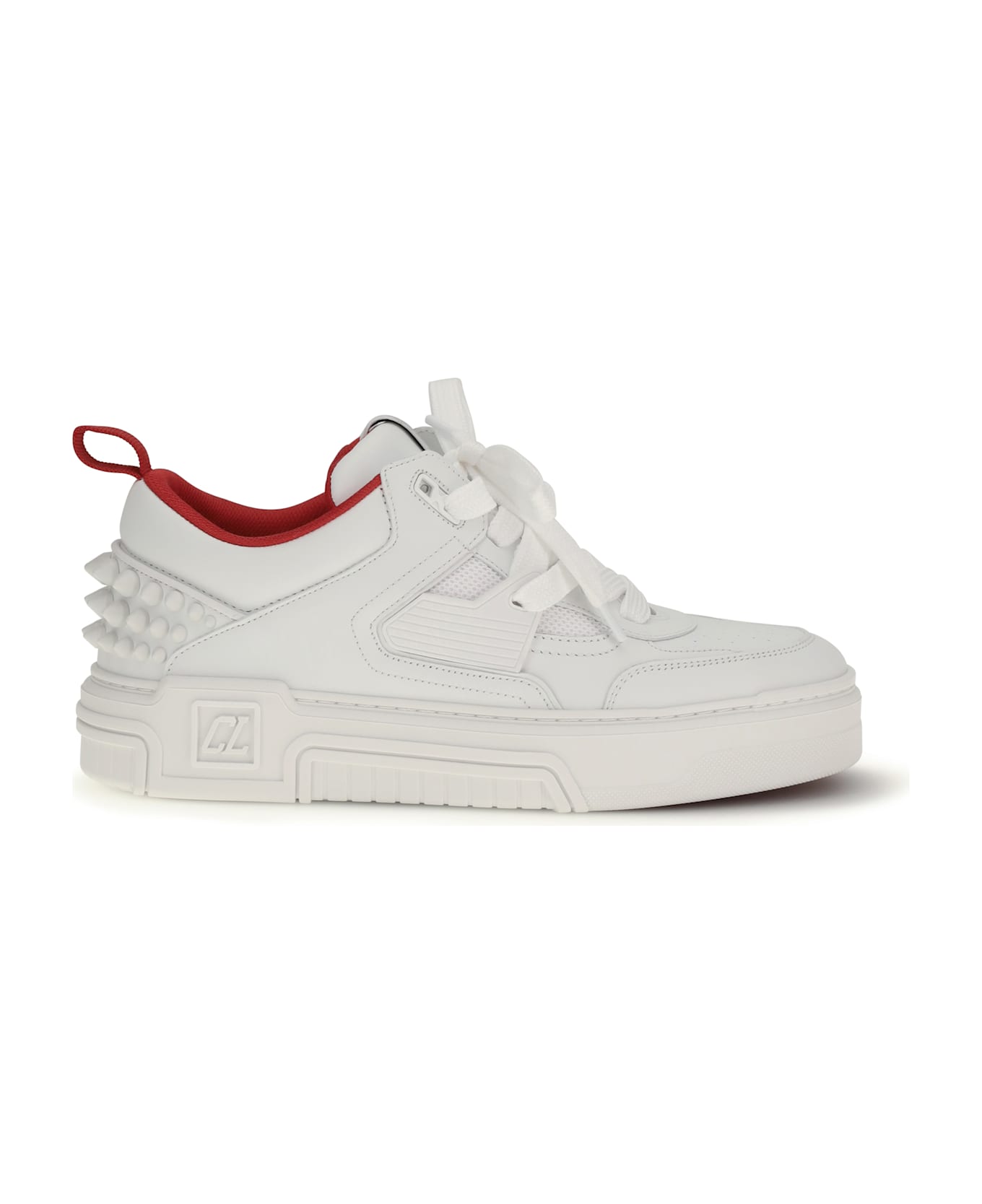 The astroloubi sneakers by christian louboutin combine comfort and iconic style in a bold, contemporary design. featuring a lace-up closure and paneled design, these sneakers stand out for their iconic red sole, the brand's distinctive symbol. the pull tab on the heel and metal studs on the back add a rock-chic touch, while the logo patch on the tongue and perforations on the toe complete the look with unique and sophisticated details. perfect for those looking for a mix of luxury and practicality in a single pair of shoes.