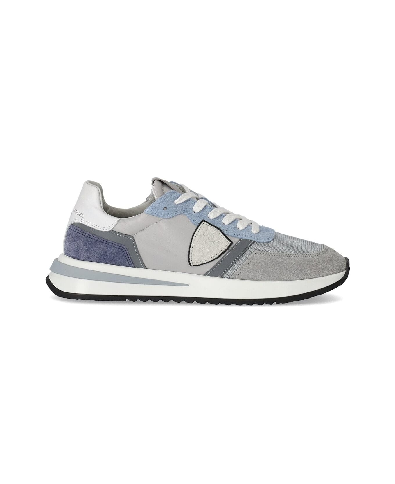 Tropez 2. 1 Low sneaker by Philippe Model made of nylon, mesh and suède in shades of grey, light blue and denim blue, featuring inserts in reflective fabric and the iconic shield on the side. White leather heel with logo, cotton terry lining and fabric insole. Rubber sole, height 4 cm.