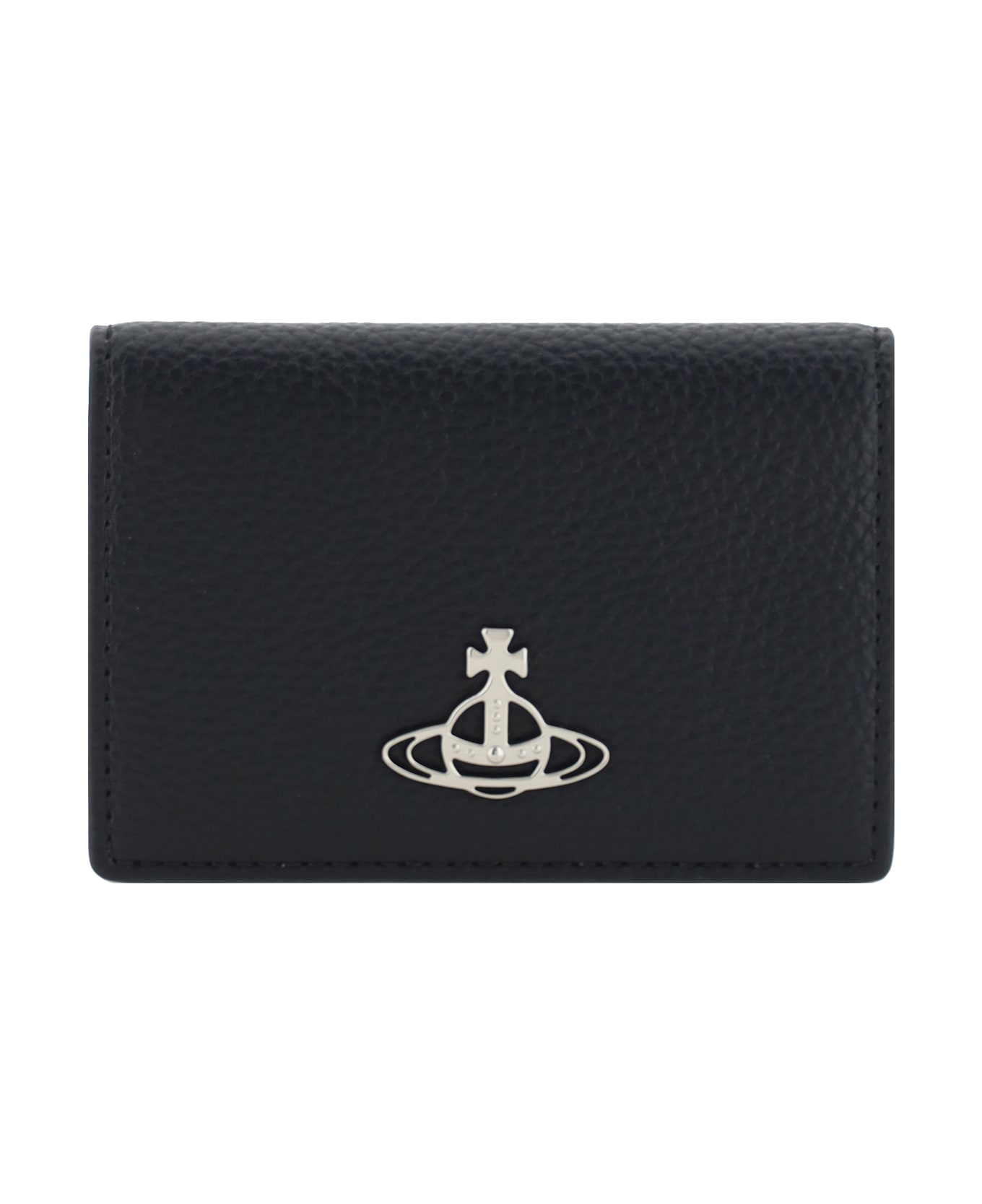The leather card holder by vivienne westwood is a stylish and functional bifold model. it features interior card slots, a coin compartment and a plaque with the famous orb logo applied to the front, combining practicality with distinctive style.