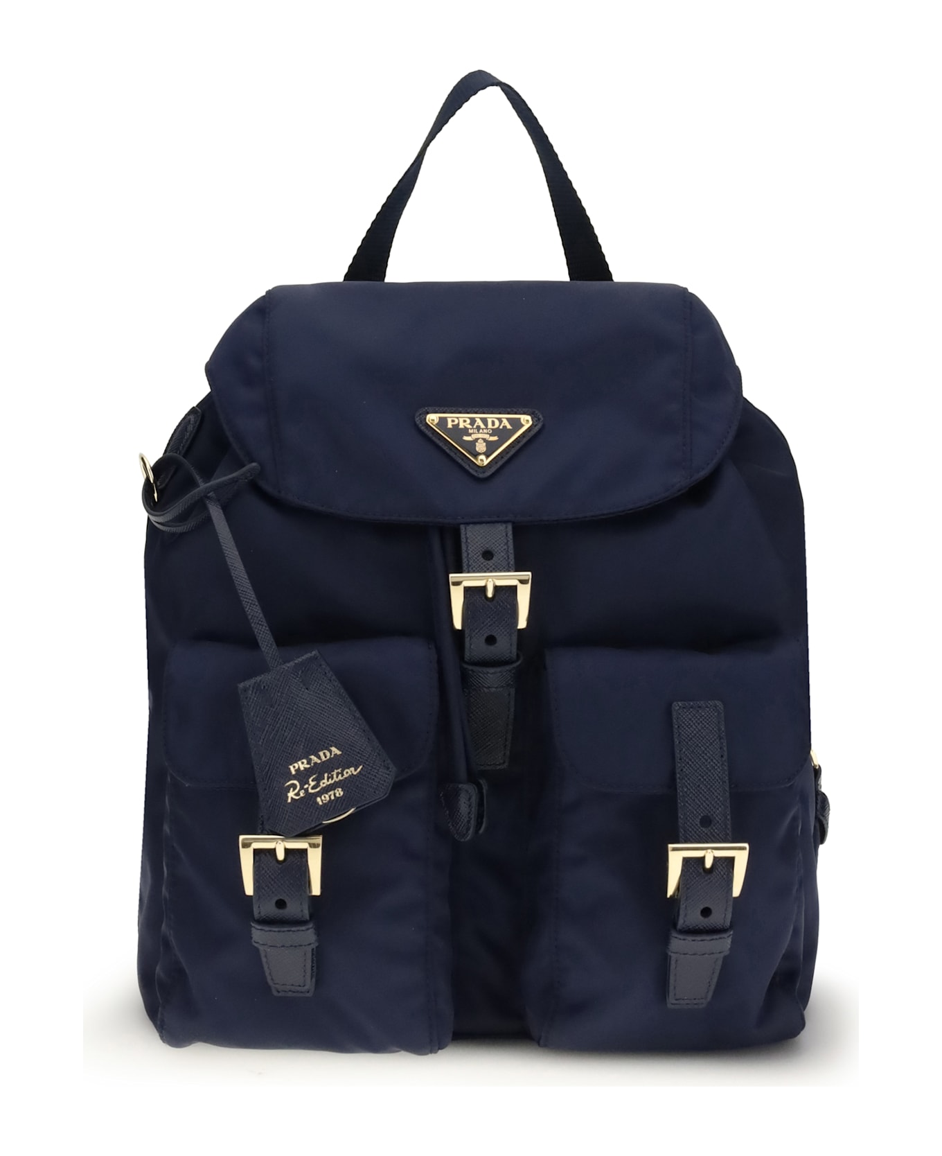 Re-nylon 1978 re-edition backpack by prada, front leather flap and buckle closure, gold-plated contrasting hardware, two flap patch pockets on front with buckle closure, top handle, adjustable shoulder straps, zip-tag key holder attached, drawstring closure inside. Composition: 100% % Recycled Polyamide