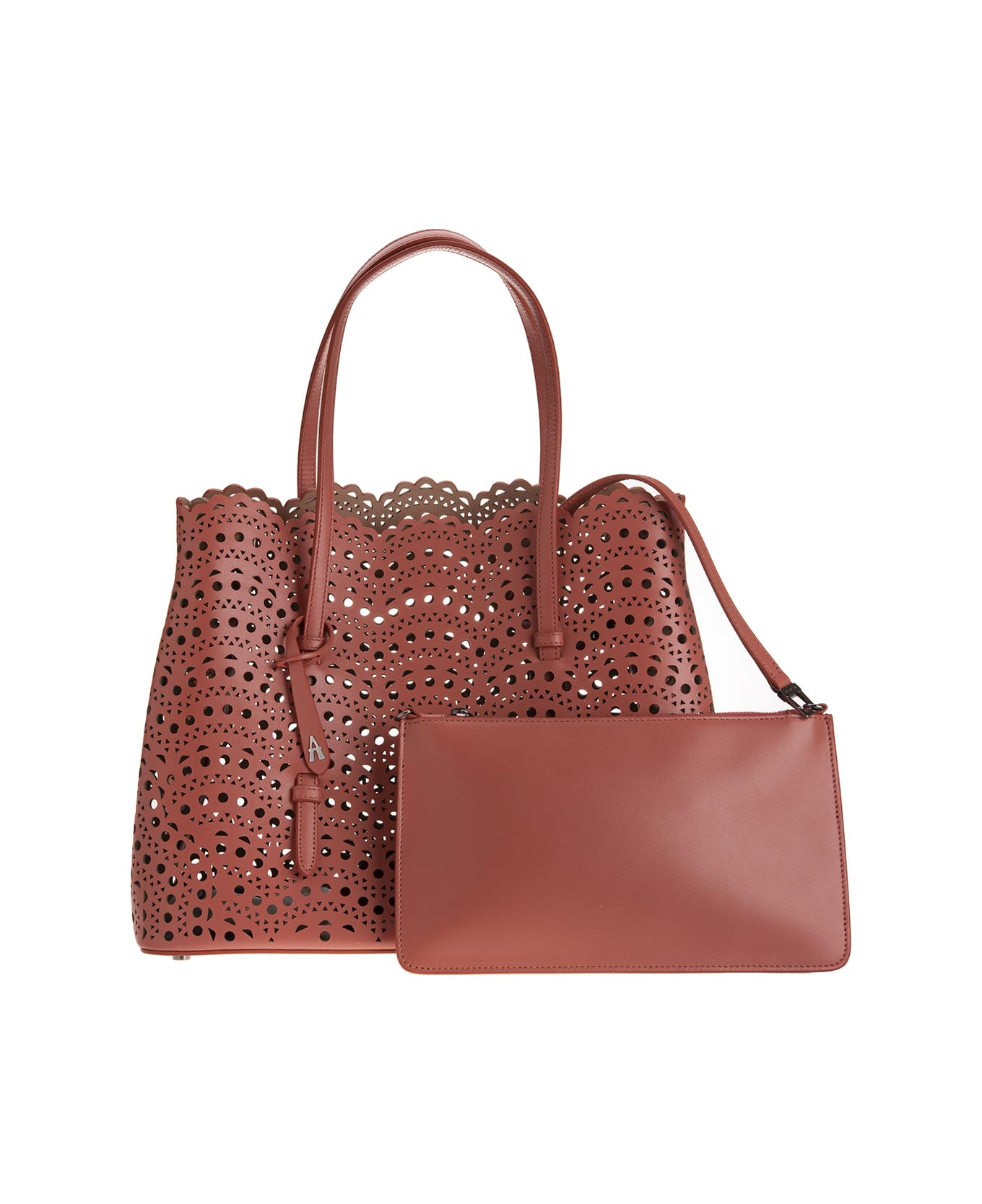 Caramel-colored Mina 25 tote bag for women by Alaia made of perforated calfskin and featuring two handles, removable shoulder strap, single internal compartment, removable leather clutch, lambskin lining, silver galvanized metal elements and extendable gusseted sides with snap buttons. It can be carried by hand or over the shoulder.