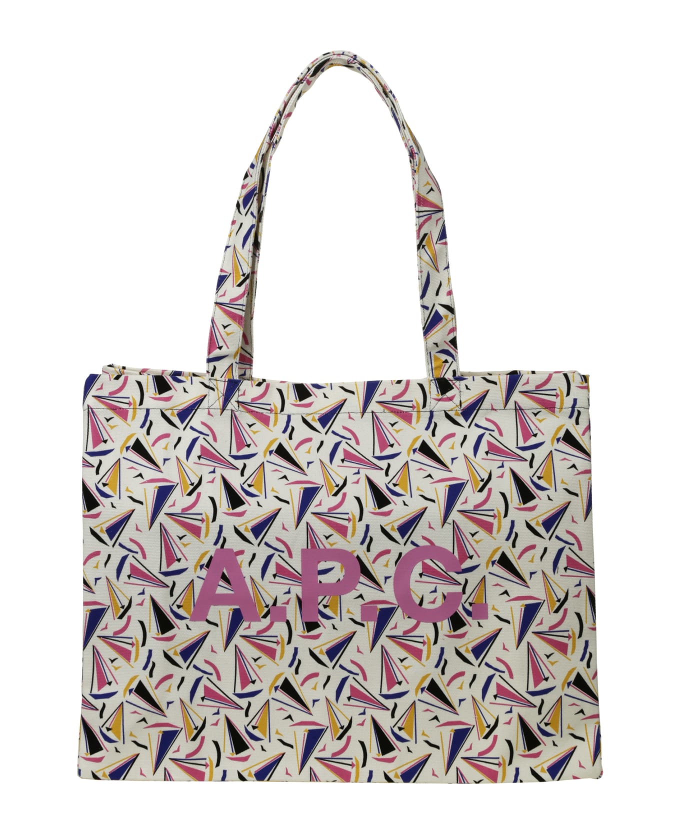 A. P. C. White cotton bag, multicolor pattern, pink logo.