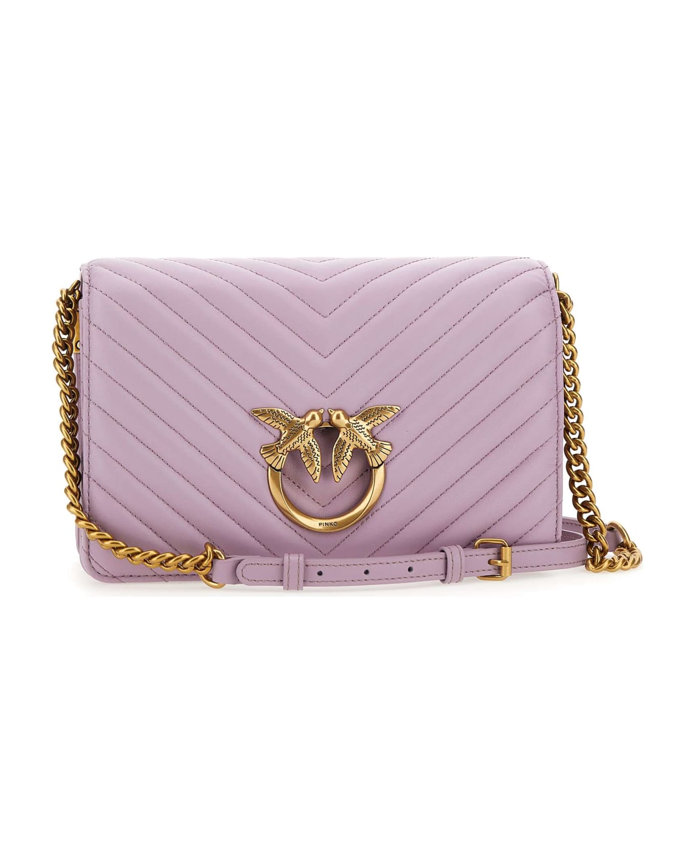 Pinko "Love Click Classic" very soft nappa shoulder bag, lilac, iconic Love Birds plaque on front, quilting with chevron motif, gold metallic finishes, top flap closure and magnetic buttons, adjustable shoulder strap in leather and chain, internal divider with pocket closed by zip. Dimensions: height 16cm, length 25cm, depth 9cm.