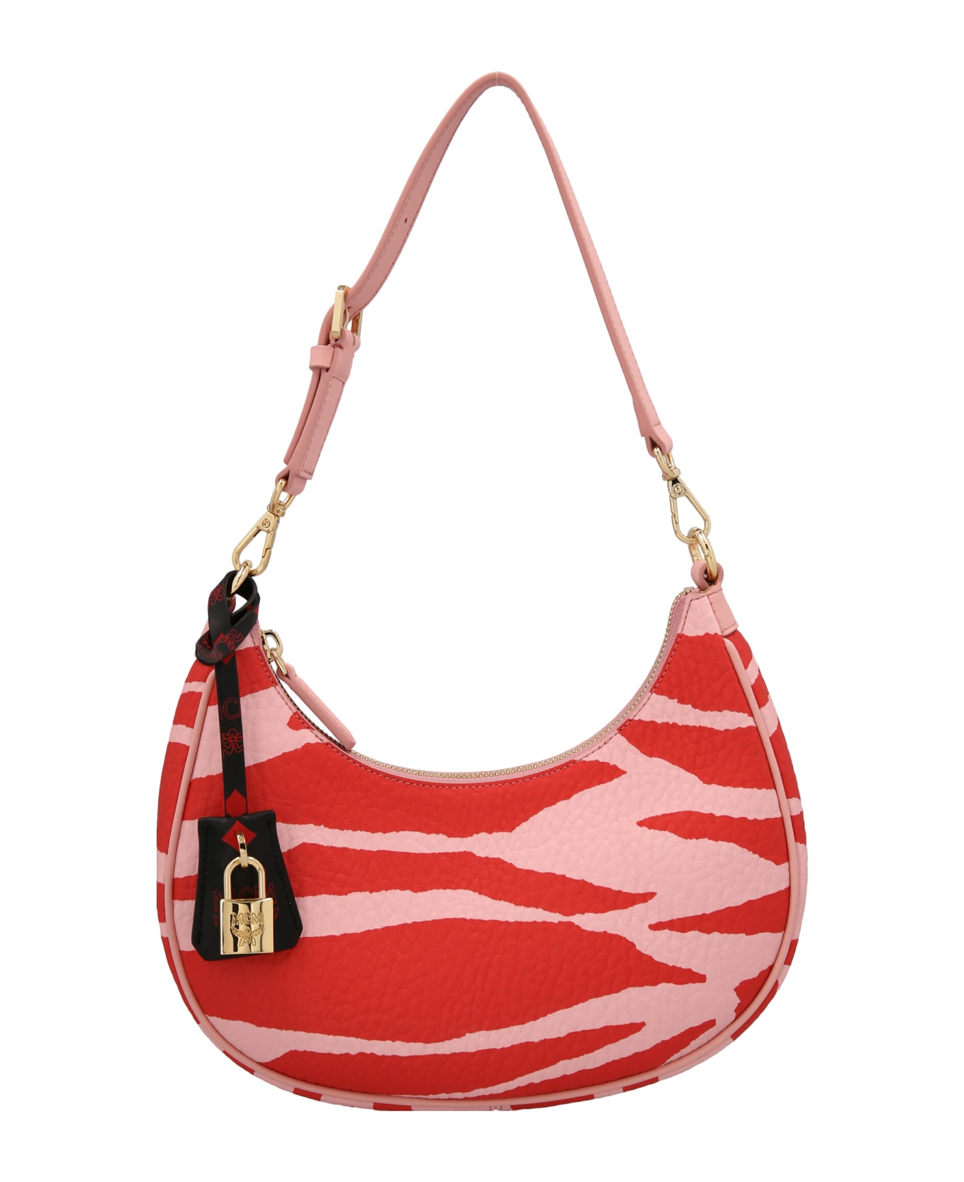 Aren Mini' all over zebra print leather shoulder bag with zip closure, with adjustable handle and a removable padlock charm.