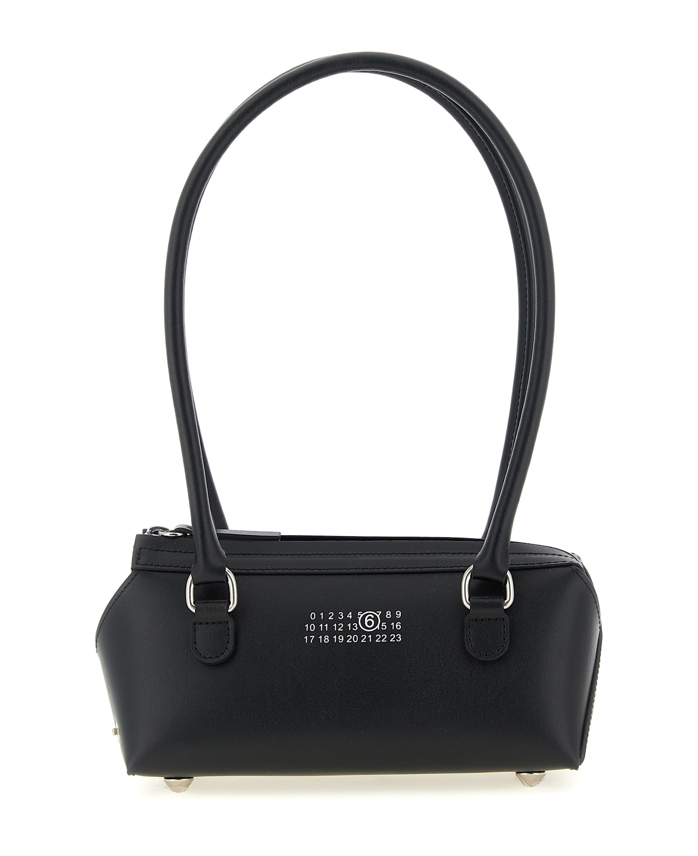 Mini 'Bauletto' smooth leather bowling shoulder bag with horizontal design, front embossed 'Numeric Signature MM6' print, double fixed tubular handle, top zip closure, back 'White Stitch Line', rigid base with metal feet, lining.