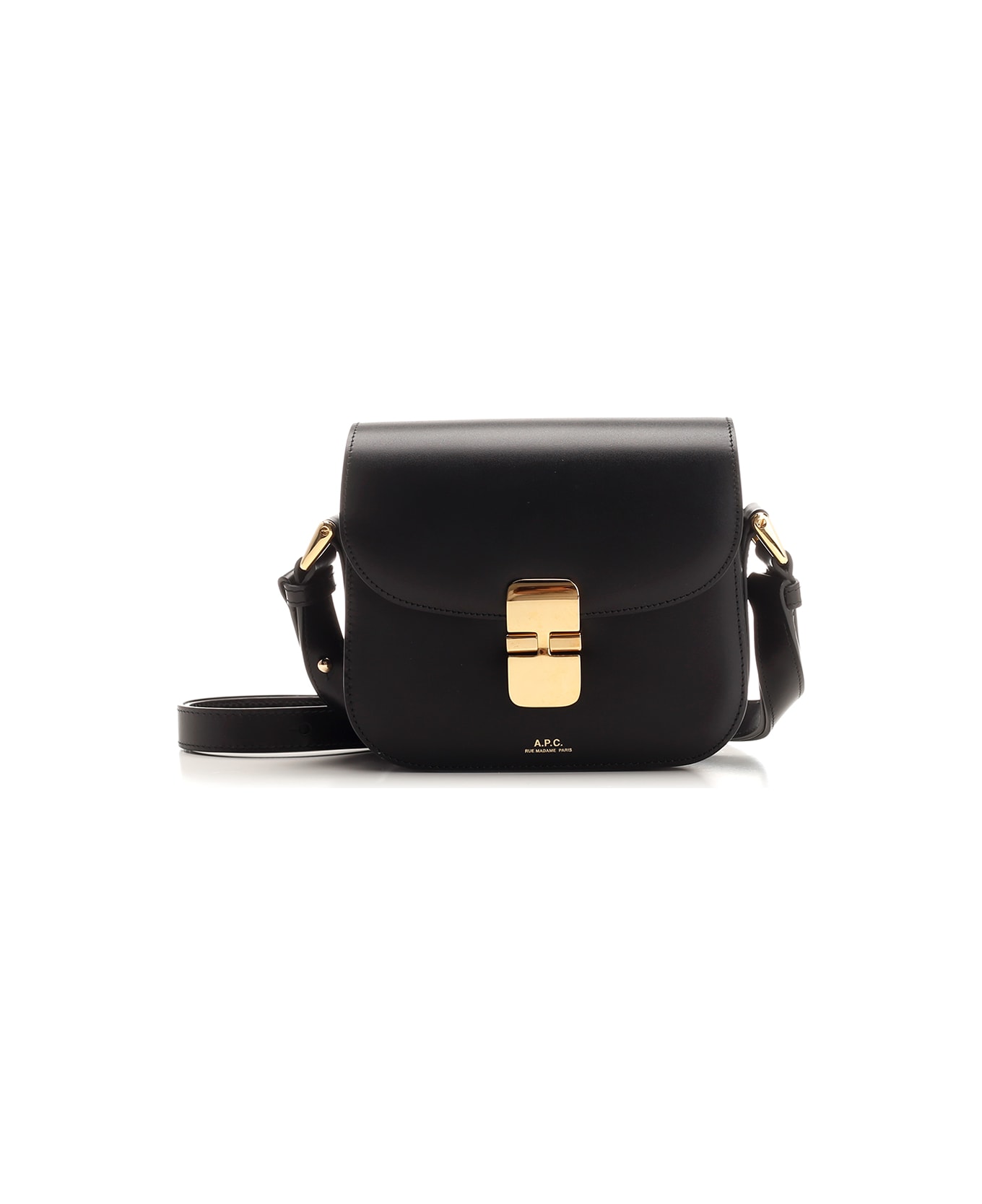 'Grace' mini shoulder bag in black semi-glossy leather from A. P. C. , with adjustable shoulder strap, flat pocket under the flap, lined interior space. Composition: 100% ZH-VACHE