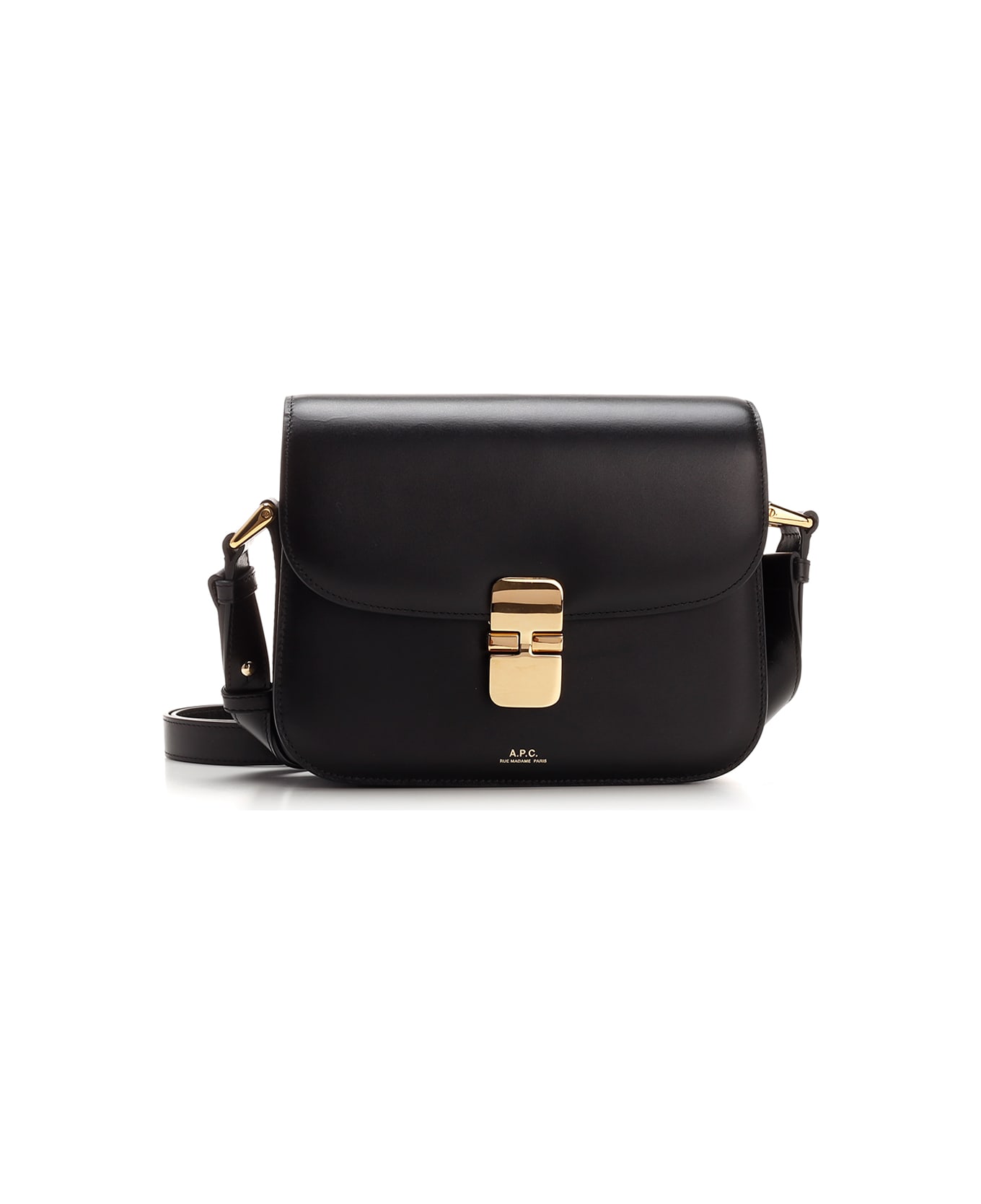 'Grace' small shoulder bag in rigid leather from A. P. C. with adjustable shoulder strap and shiny gold metal snap closure.