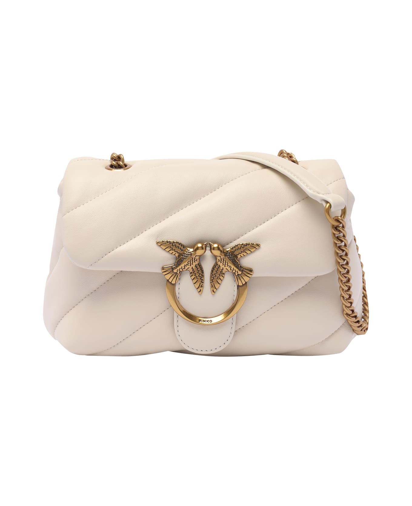 Pinko black Love Mini Puffer shoulder bag, magnetic interlocking closure, two compartments, one open and the other with magnet, inner zip pocket, one open pocket, strap with chain, golden logo on front
