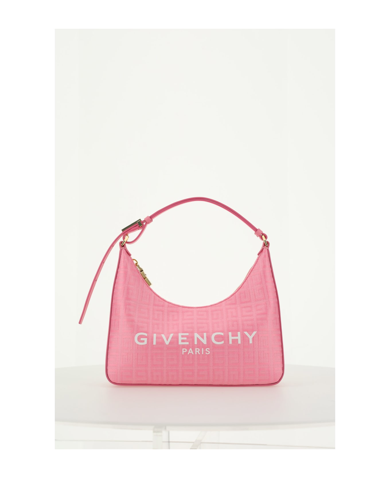 Moon bag by givenchy, zippered top closure, iconic brand signature engraved on zipper pull, adjustable shoulder strap, grained leather effect design with repeating logo on front and back, brand monogram printed in contrast on front, single interior compartment.
