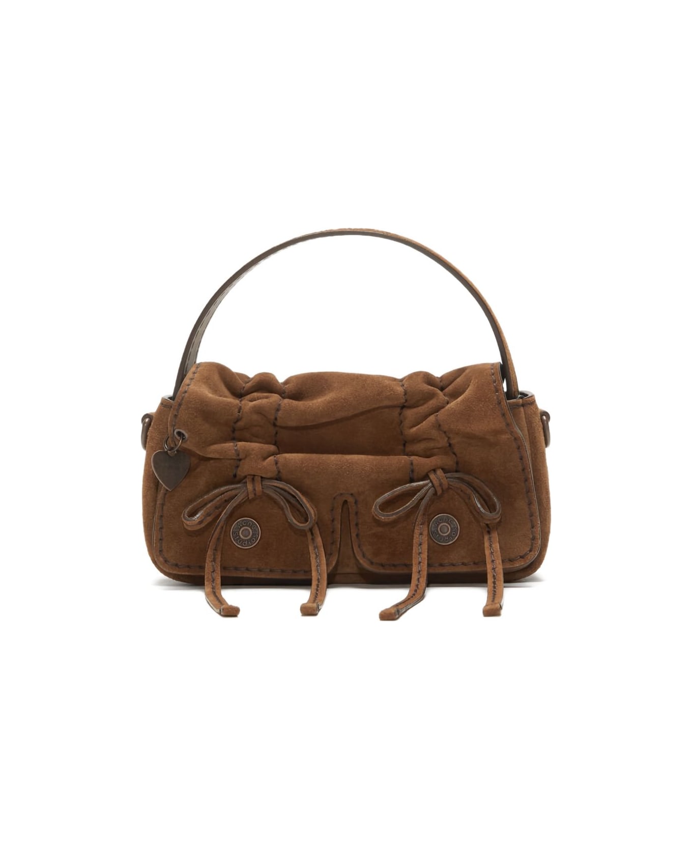 cognac brown top handle front pockets drawstring detail heart charm seam detail