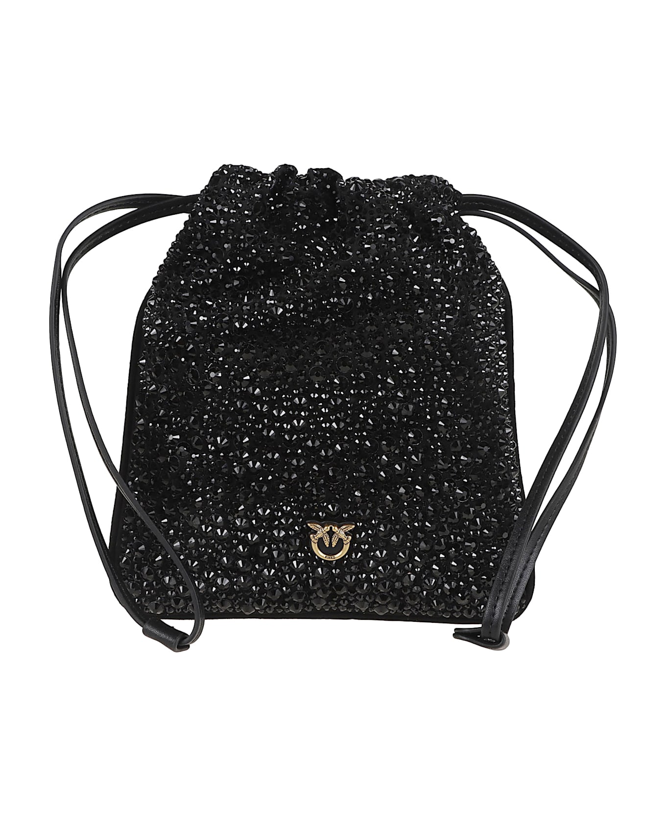 Small fabric Slouchy Bag by PINKO. Lined in cotton drill; one zipped pocket; drawstring closure. Featuring a rhinestone trim and a plaque with the iconic Love Birds logo on the front.