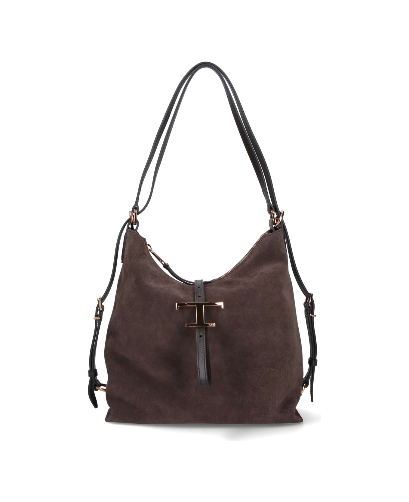 Tod s T-timeless shoulder bag in dark brown calf leather with adjustable and removable shoulder strap, zip and buckle closure, gold metal "T-Timeless" logo detail on the front, main inner compartment. Composition: 100% Calf Leather