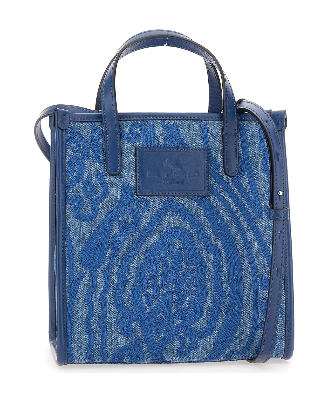 Etro "Shopping Mini" fabric with leather details handbag, blue, double top handle, embroidery with matching Paisley motifs, ETRO and Pegasus logo patch on front, cotton lining, adjustable and removable shoulder strap 50cm, inside pocket with zip , silver metallic finishes. Dimensions: length 22cm, height 23cm, depth 14cm. Made in Italy.