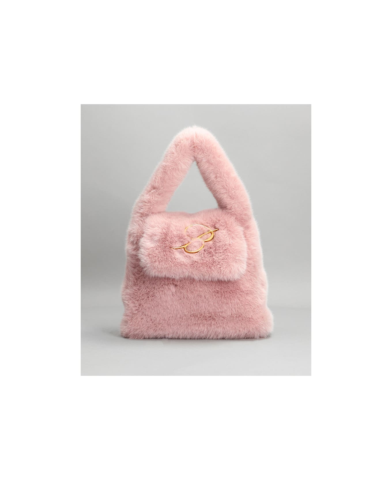 Hand bag in rose-pink polyester, handle, flap closure, metallic logo, gold hardware, faux fur, Made in Italy