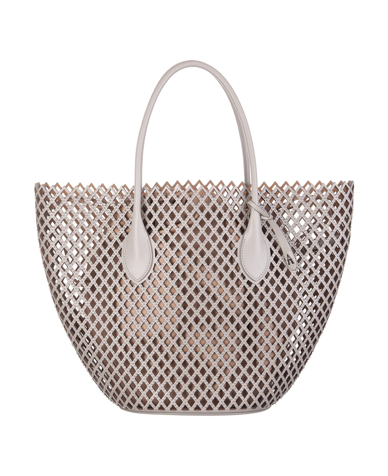 Large pearl grey shopping bag by Alaia entirely made of perforated leather with a geometric pattern and finished with silver galvanized micro-studs applied all-over. Model characterized by two handles to carry the bag by hand or on the shoulder and a single internal compartment with a fabric pouch closed by a drawstring.