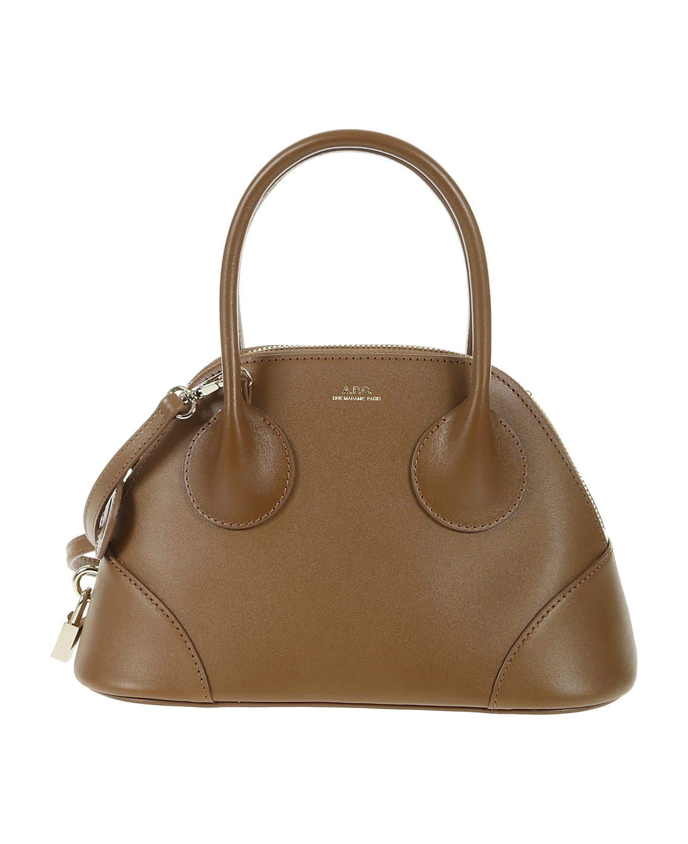 A. P. C. Camel leather bag, golden inserts, logo detail on the front, internal shoulder strap. Composition: 100% Zh