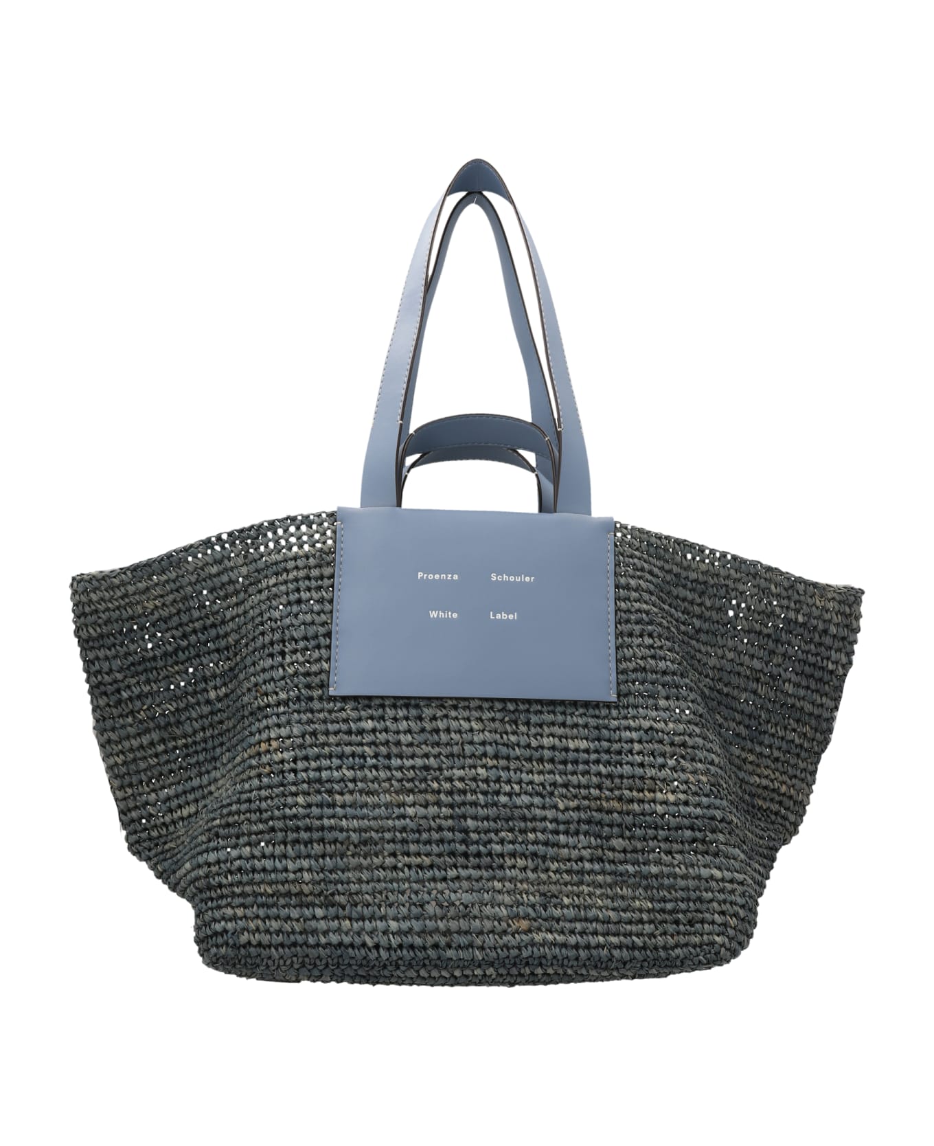 XL Morris Raffia' raffia shopping bag with leather handles, front logo patch, open upper part with snap closure, unlined interior with removable base and a zip pocket attached.