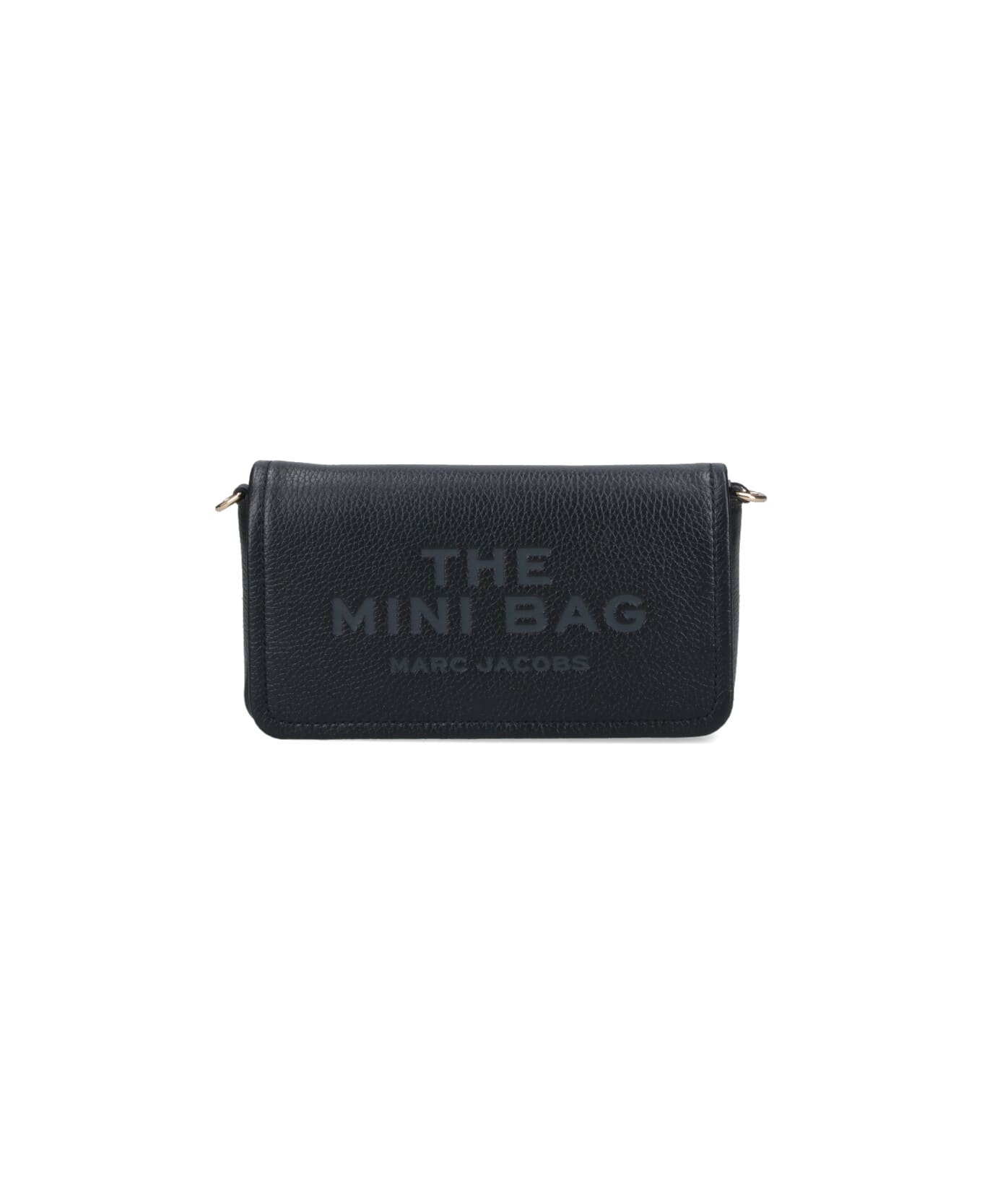 Marc Jacobs 'The Leather' mini bag in black hammered leather with adjustable and removable shoulder strap, magnetic flap closure, embossed logo detail, back logo patch, eight inner card slots, inner flat pocket, main inner compartment.