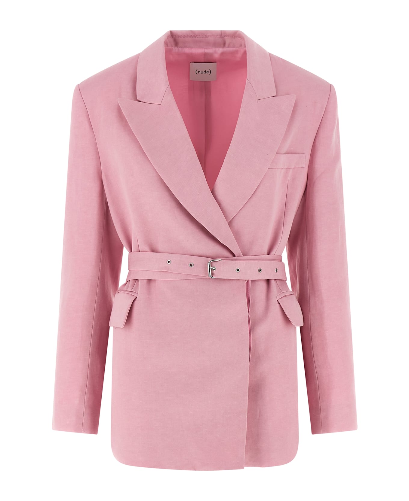 Double-breasted blazer in linen and tencel blend with concealed front button closure, peak lapels, breast pocket, flap pockets, structured shoulder strap, long sleeves, back split, and viscose blend lining.