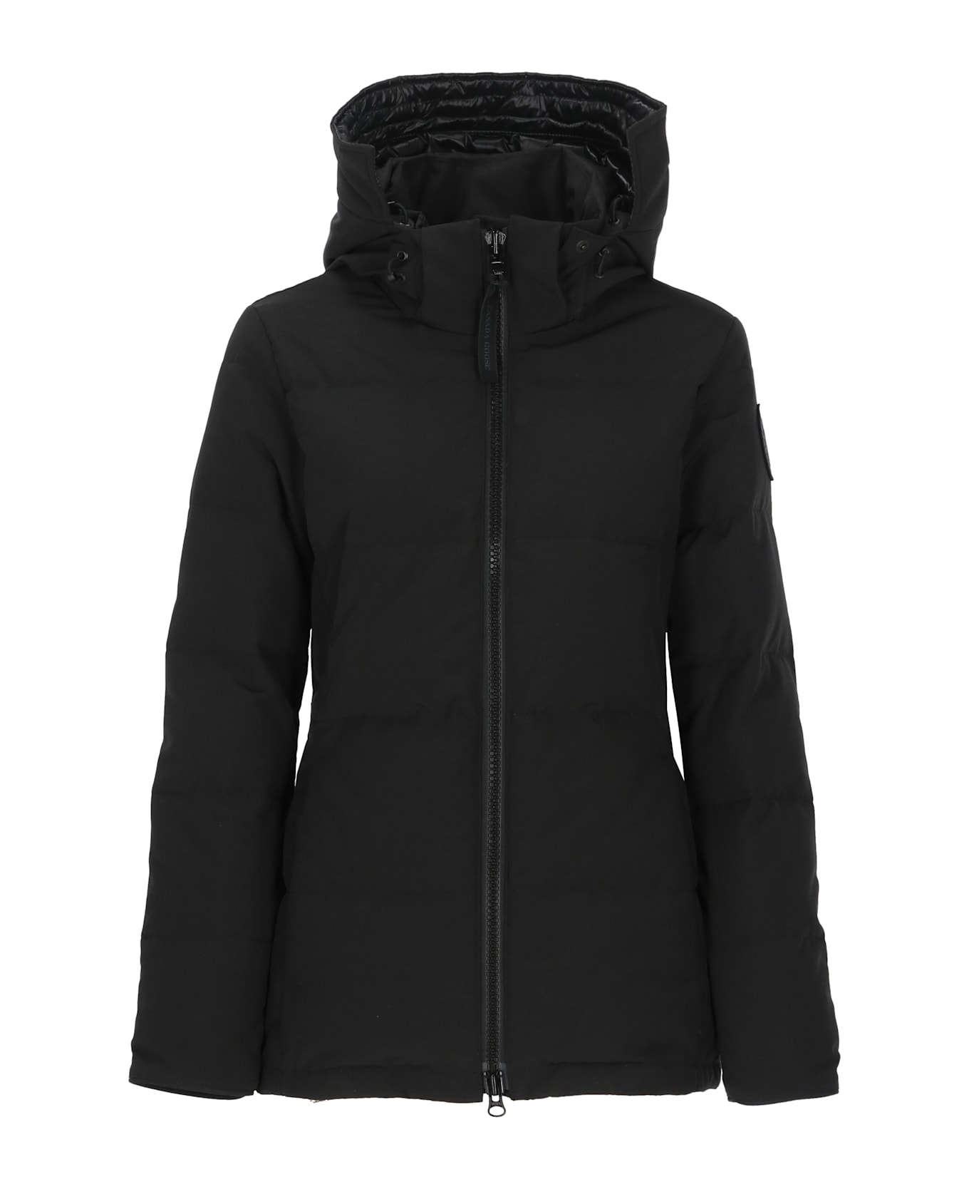 - Black Canada Goose padded parka for woman - Removable hood - Long sleeves - Contrasting color logoed patch at left sleeve - Front zip fastening - Two side zip pockets