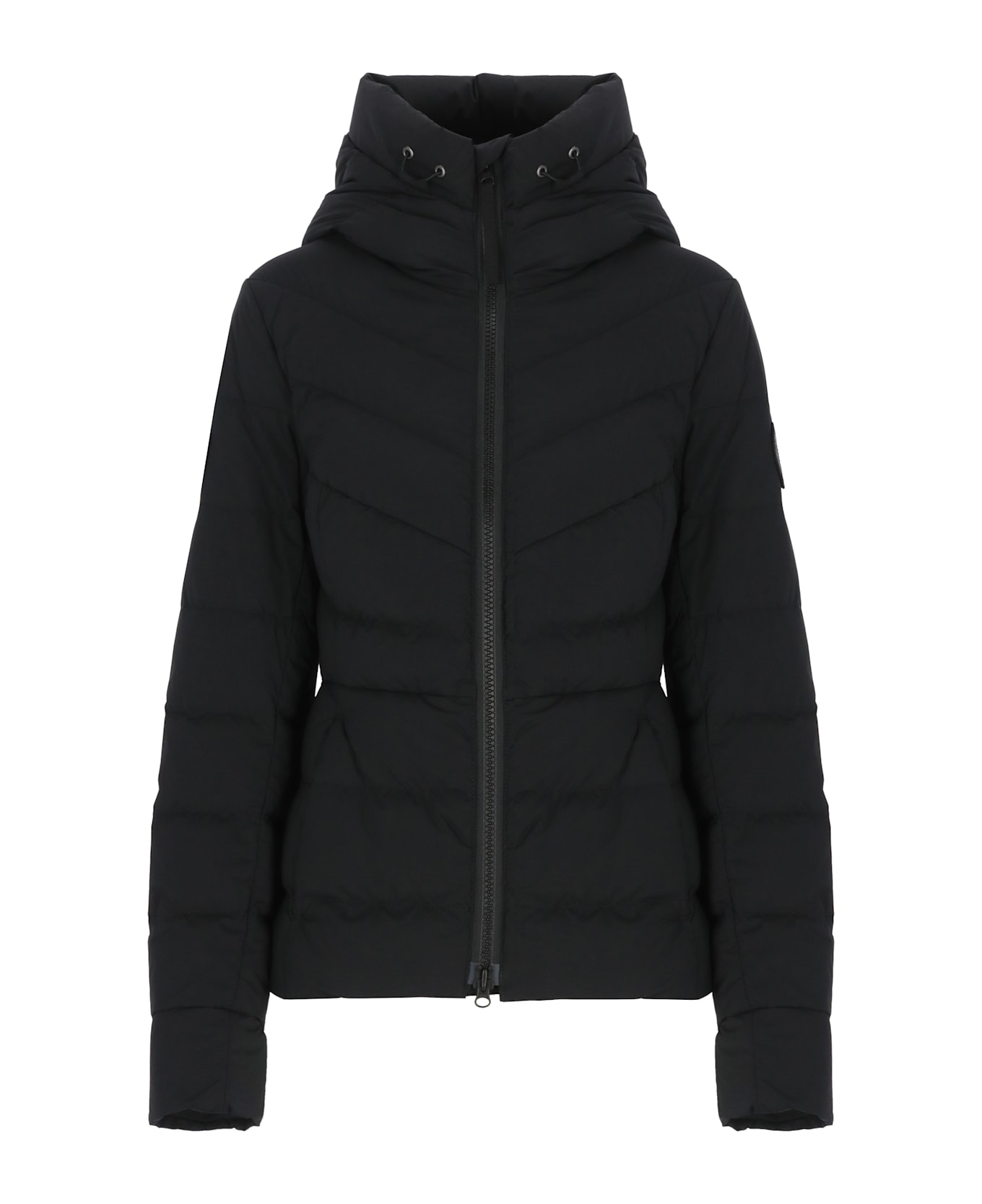 - Black Canada Goose down jacket for woman - Hood - Long sleeves - Contrasting color iconic logoed patch at left sleeve - Front zip fastening - Two front zip pockets