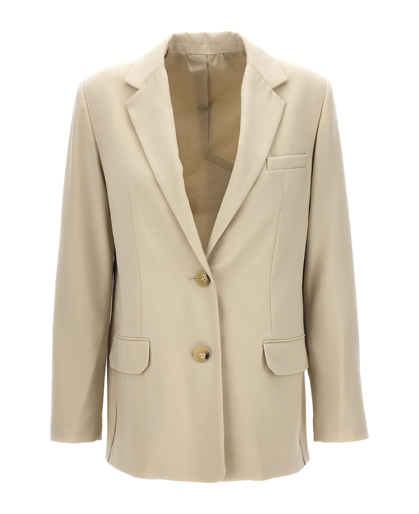 Single-breasted wool blend blazer with button closure, contrasting logo band, pockets, long sleeves, and back split. Composition: 53% polyester 43% virgin wool 4% elastane