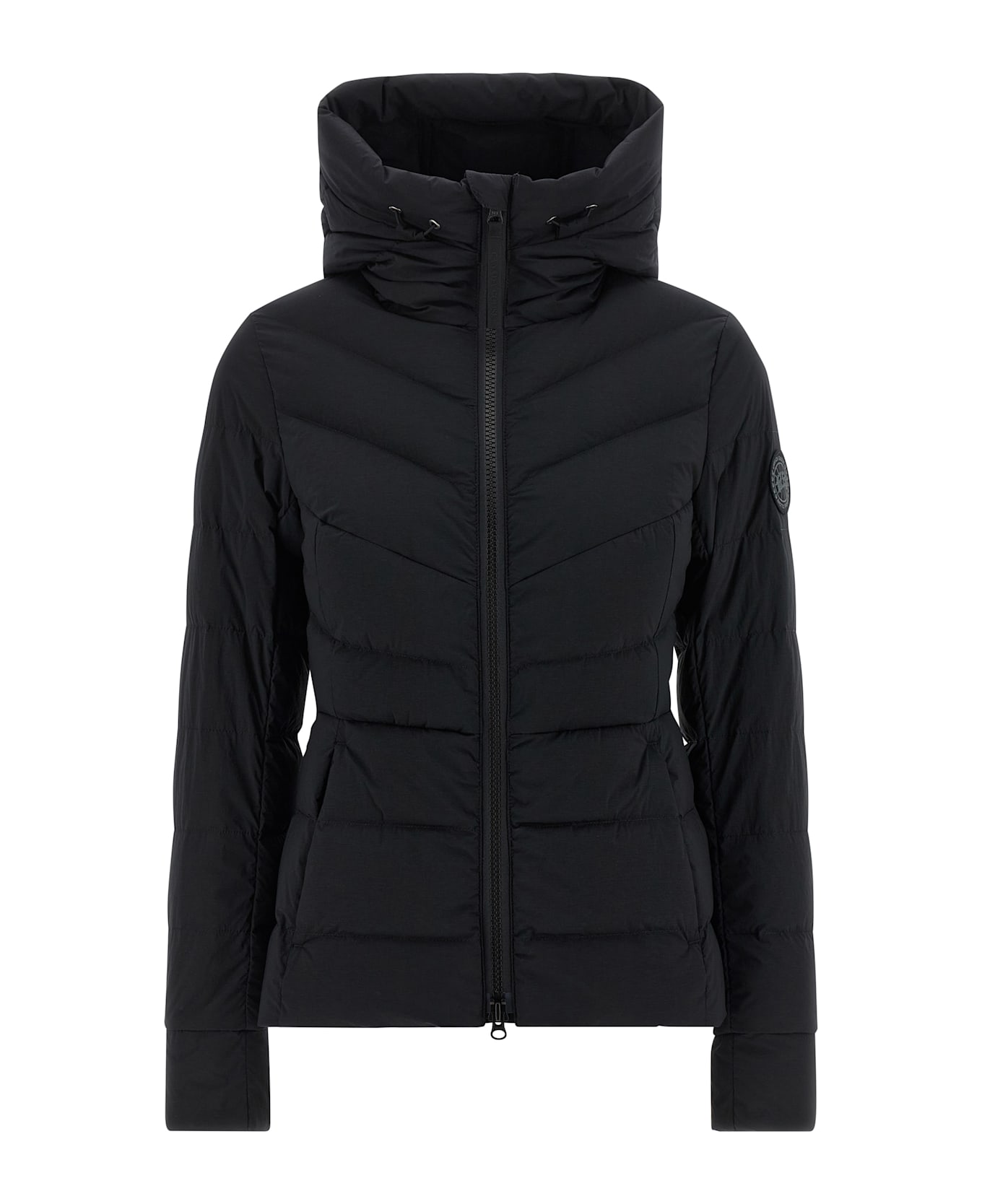 'Clair' down jacket in Aira, a bielastic fabric with a matte finish, quilted and goose feather padding, hourglass silhouette with shaping stitching, adjustable snorkel hood, high neck, front zip closure, pockets, long sleeves with Power Stretch® cuffs and tone-on-tone logo patch applied. Internal backpack braces to carry the garment without using your hands. SUSTAINABLE: Product made with recycled materials.