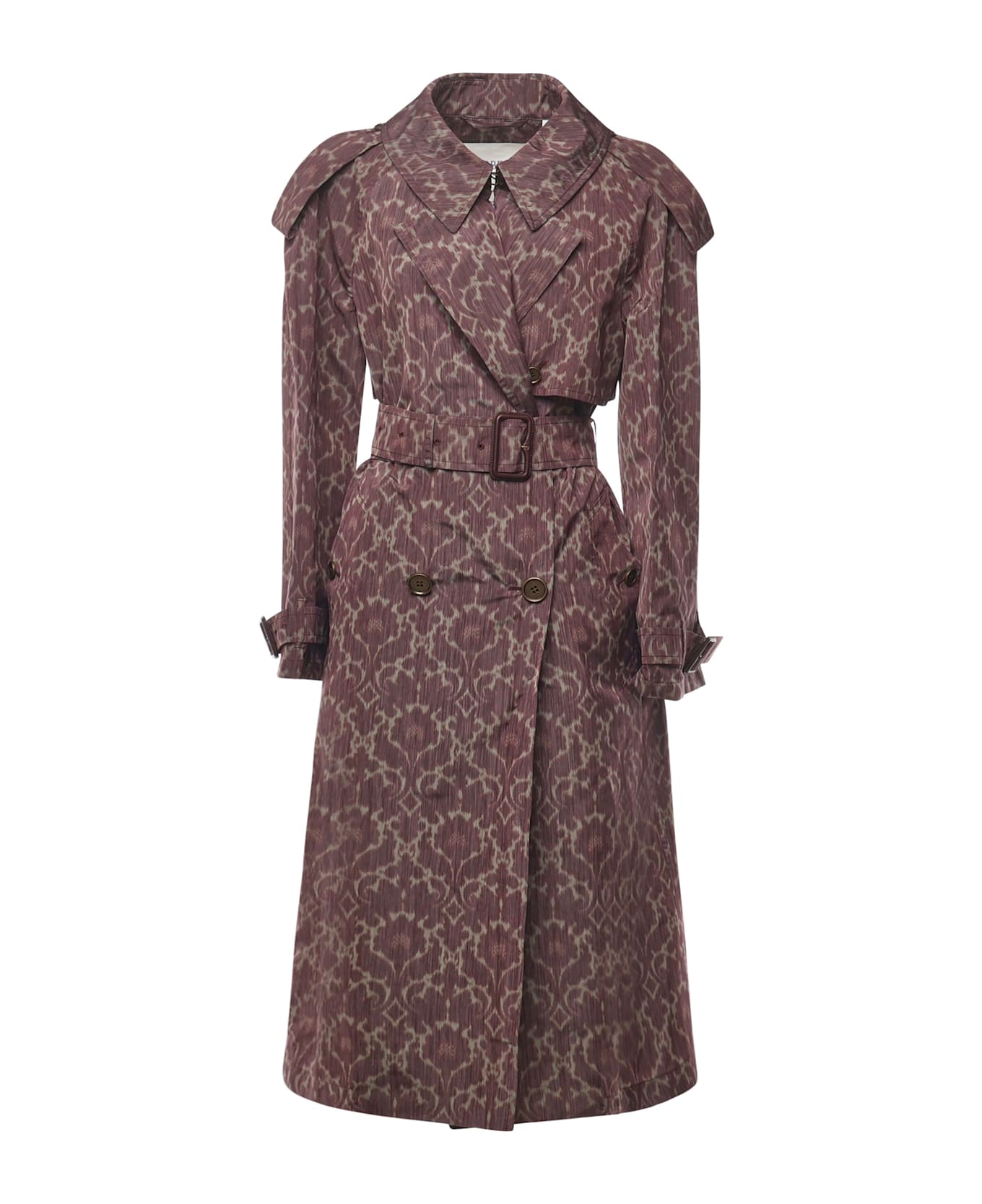 -Double-breasted closure -Buckle belt -Side welt pockets -Belt cuffs -Size shown in photo is 06 -Designer color: Duchess Red