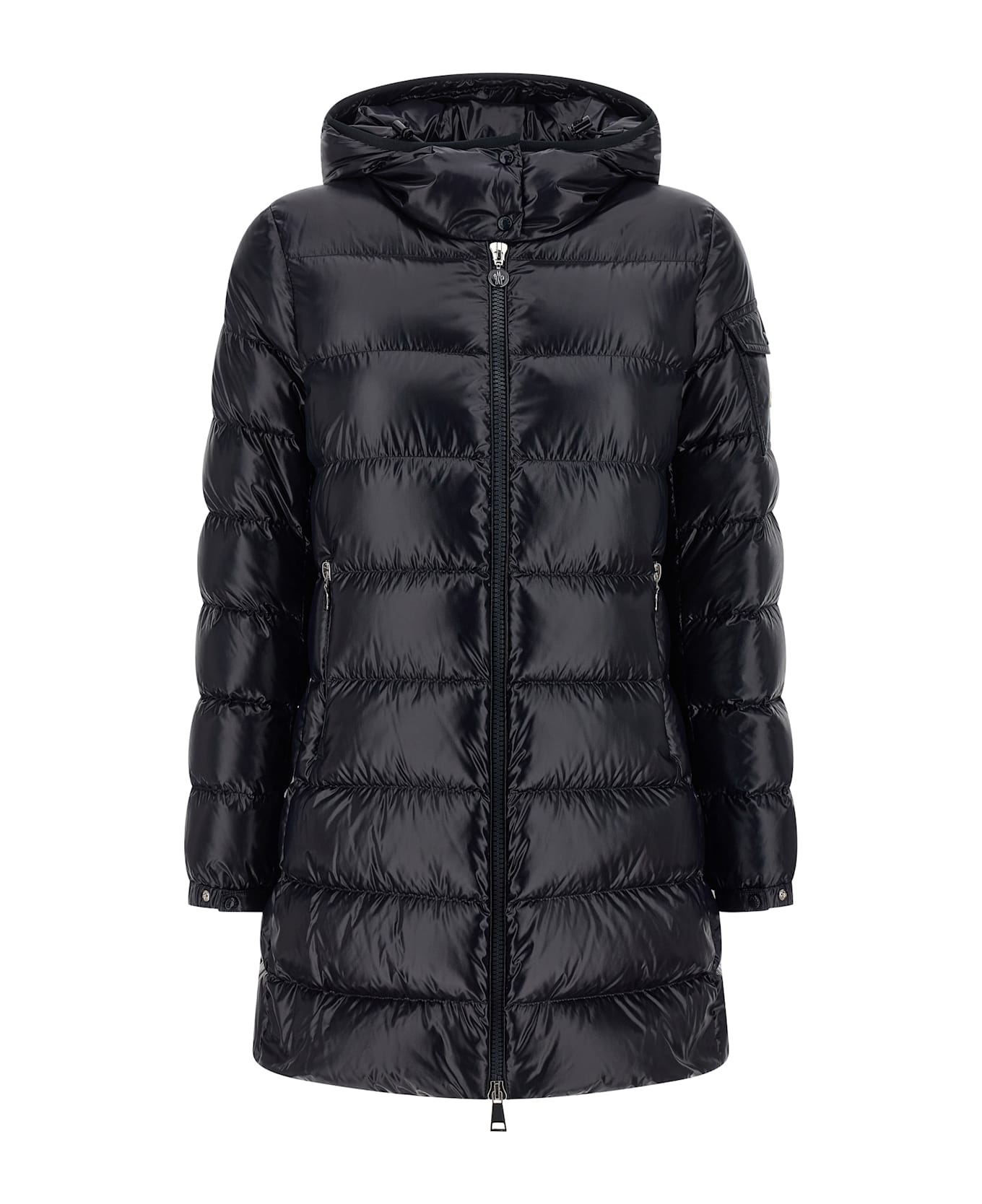 'Courcelles' water-repellent quilted nylon laqué down jacket with goose down padding, adjustable hood with snap button closure, front zip closure, pockets, long sleeves with elastic cuffs, felt logo patch, drawstring at the waist and on the hem.