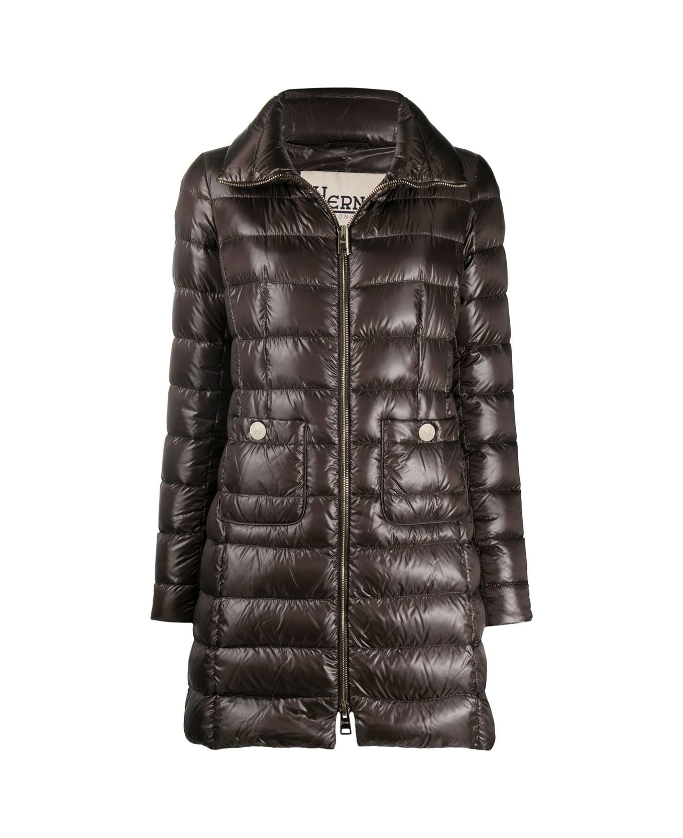 brown goose down-feather down blend quilted front zip fastening high neck two front patch pockets mid-length Composition: Outer: Polyamide, 100%