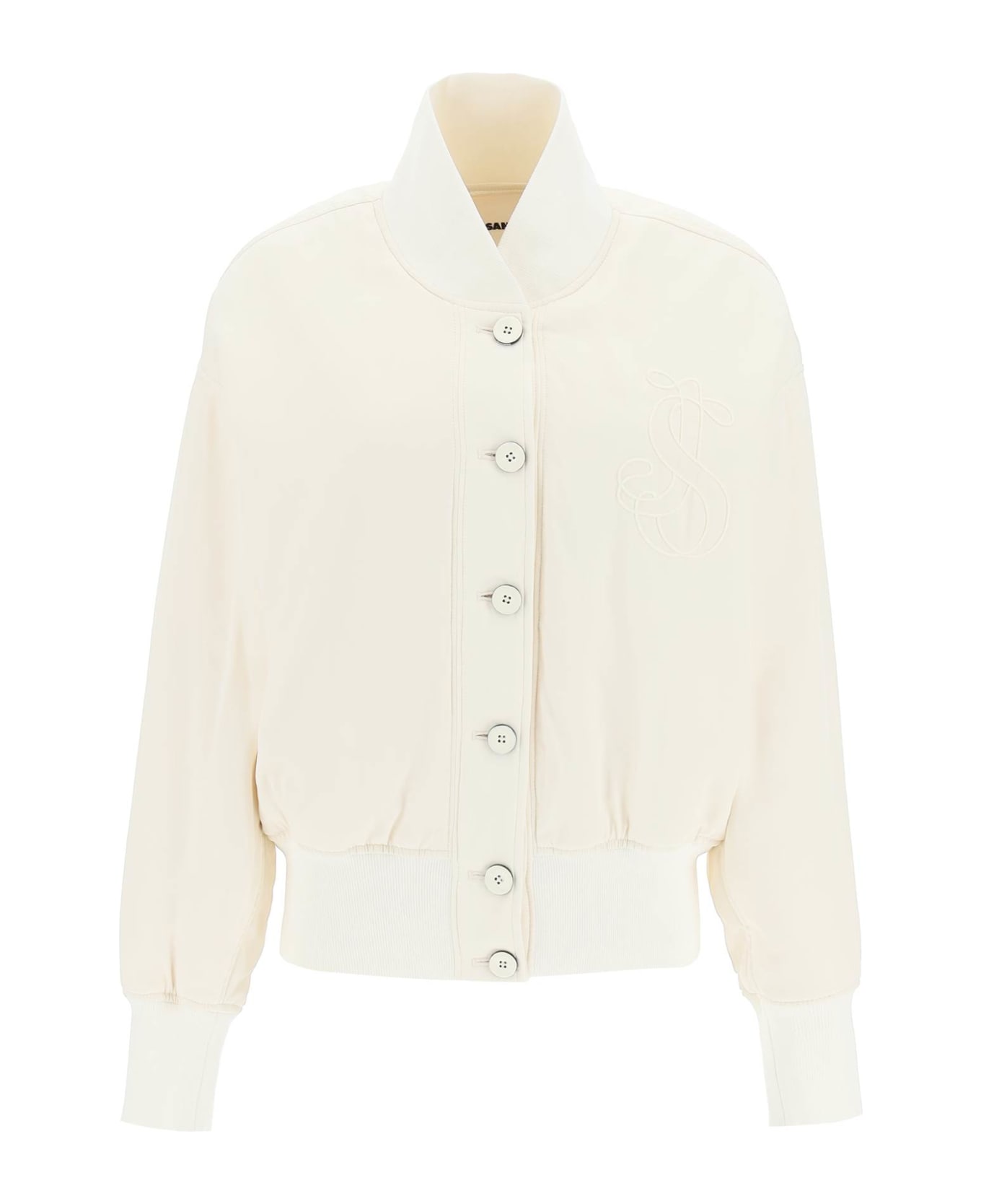 Viscose bomber jacket by Jil Sander with silk-blend padding and ribbed hems. It features a button closure, side inseam pockets and it is personalized by a chest embroidered monogram. Oversized fit. The model is 187 cm tall and wears a size EU 36. Composition: 100% VI