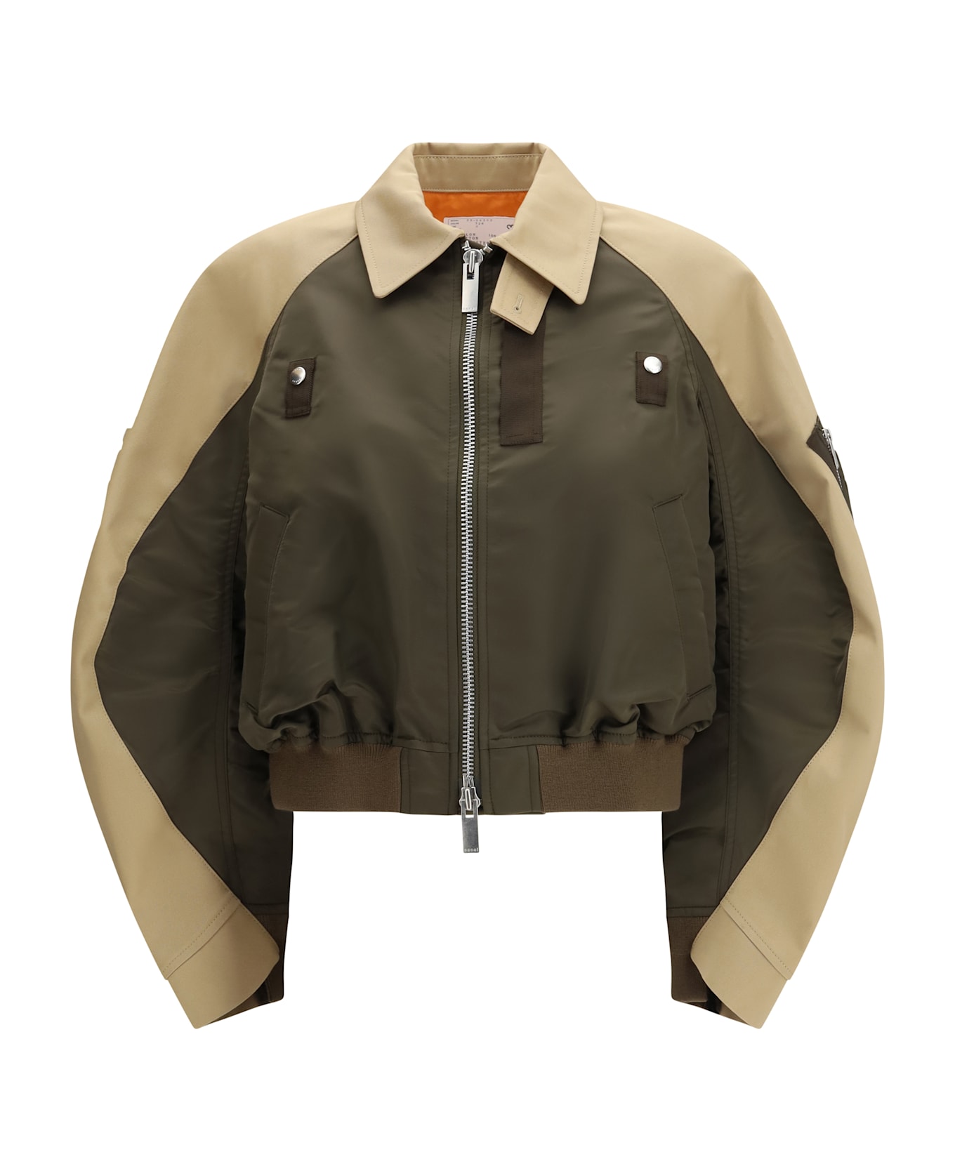 The cotton and nylon bomber jacket by sacai is a versatile and modern piece, made from a blend of cotton and nylon for a lightweight yet durable structure. the classic collar and double-slider front zipper closure add a practical and stylish touch. the cotton and nylon panel design creates an interesting visual effect, while the elasticated hem ensures a perfect fit. the two side welt pockets complete the functional design, making this bomber jacket ideal for casual yet refined looks.