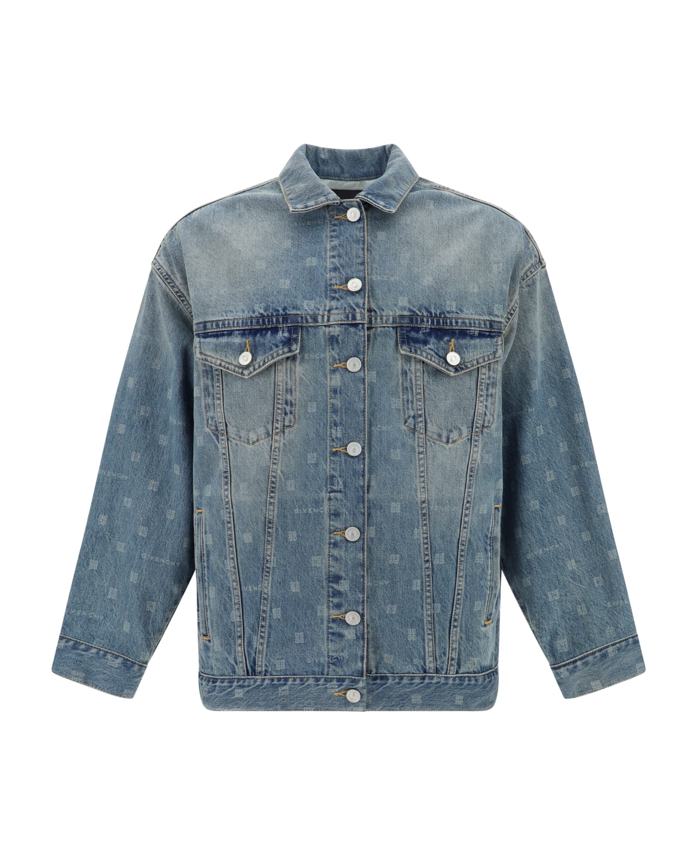 Cotton denim jacket by givenchy, classic collar, front button closure, two front patch pockets with flap for closure, two side welt pockets, adjustable cuffs with button, iconic brand logo repeated all-over contrast, regular fit.