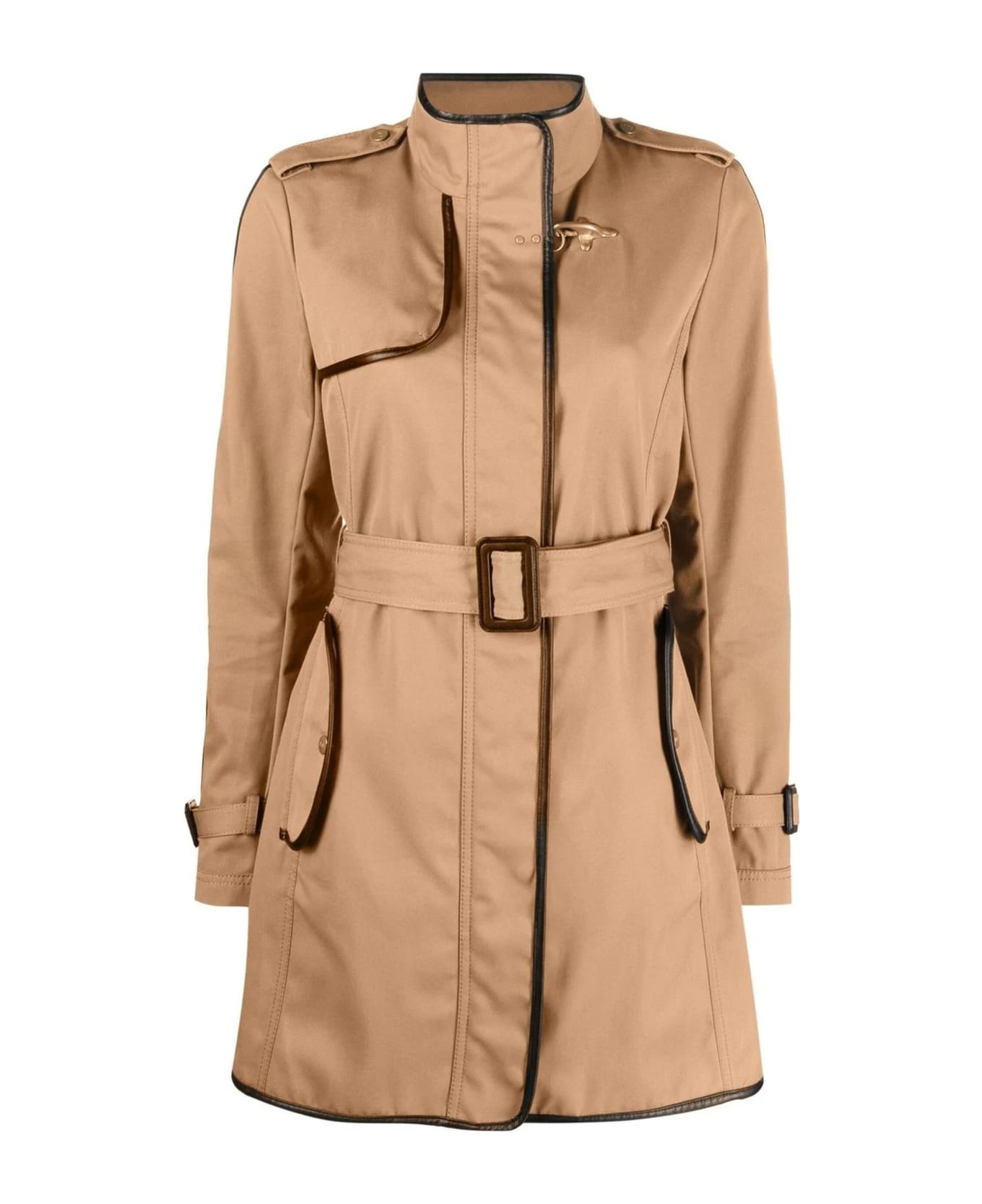 Unlined single-breasted trench coat in water-repellent technical gabardine with waist belt, contrasting trim, high neck, front toggle fastening, high neck, belted waist, long sleeves, two side flap pockets, straight hem