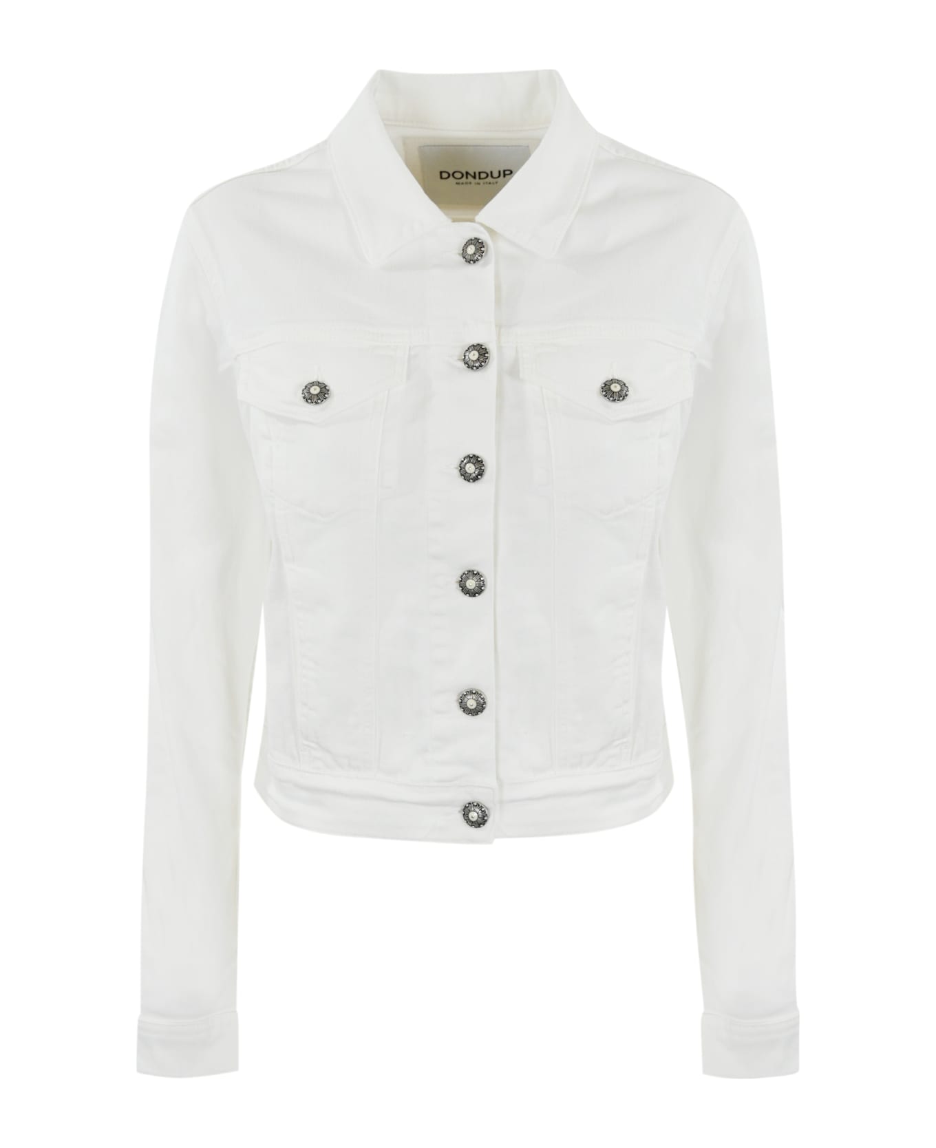 women's denim jacket: five pockets jeweled button closure classic collar long sleeves straight hem metal logo on the back slim fit color: white composition: 92% cotton, 6% elastomultiester, 2% elastane