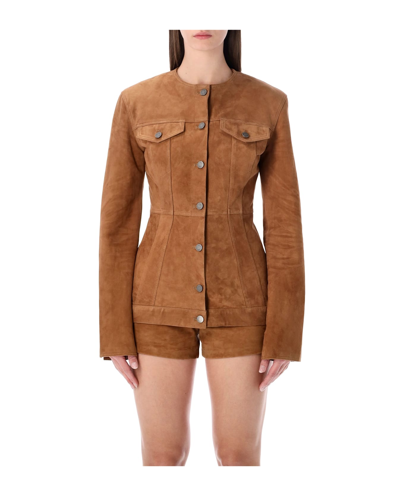 The Temple Suede Jacket By Haikure Is Crafted From Soft Tan Suede And Shaped Into A Structured Silhouette That Highlights The Waist. Drawing Inspiration From Classic Denim Jackets, It Features Flap Chest Pockets, Metallic Button Closures, And Contouring Seams For A Flattering, Elongated Look. A Refined, Timeless Layer With Modern Elegance. Structured, Waist-defining Cut Front Metallic Button Closure Flap Chest Pockets Contoured Seam Detailing Minimal, Sophisticated Finish Alessandra Is 1,75 M And Wears Size S