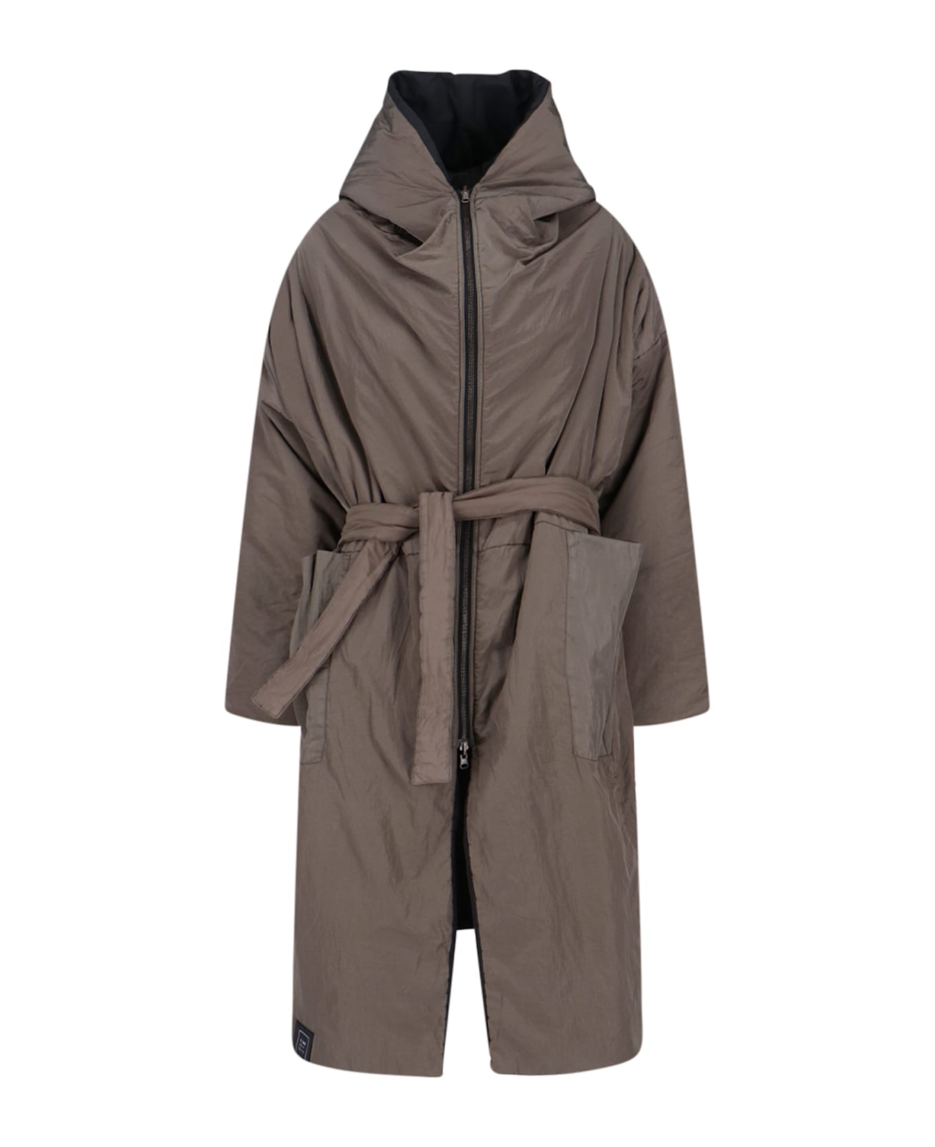 Kimo no-Rain reversible waterproof coat in brown fabric on one side and black on the other, hood, zip closure, adjustable belt at the waist, two side flat pockets, logo label on the bottom, back shoulder straps, deep front split, straight hem.