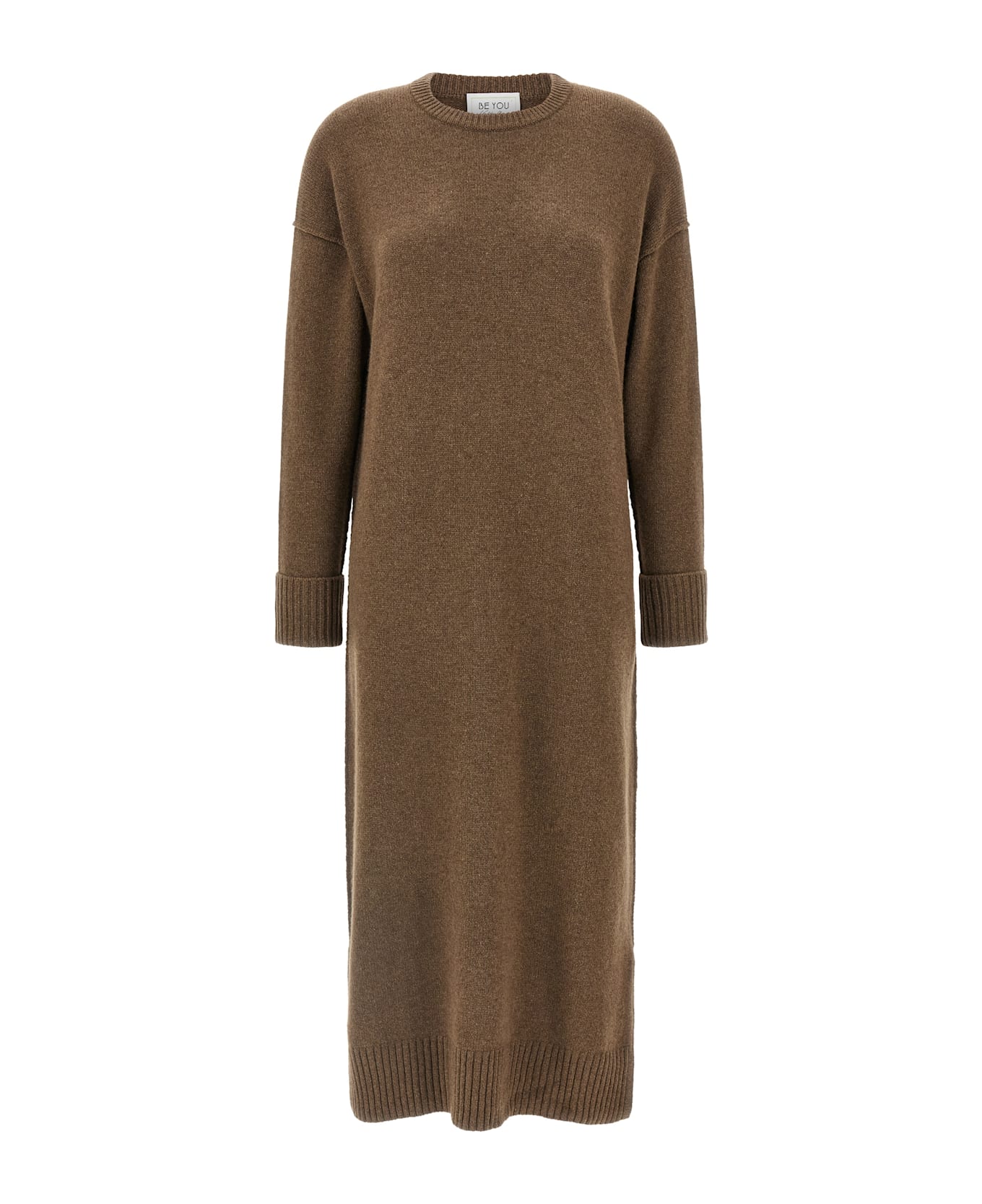 Cashmere midi dress, round neckline, long sleeves with turned-up cuffs and dropped shoulders, side slits.