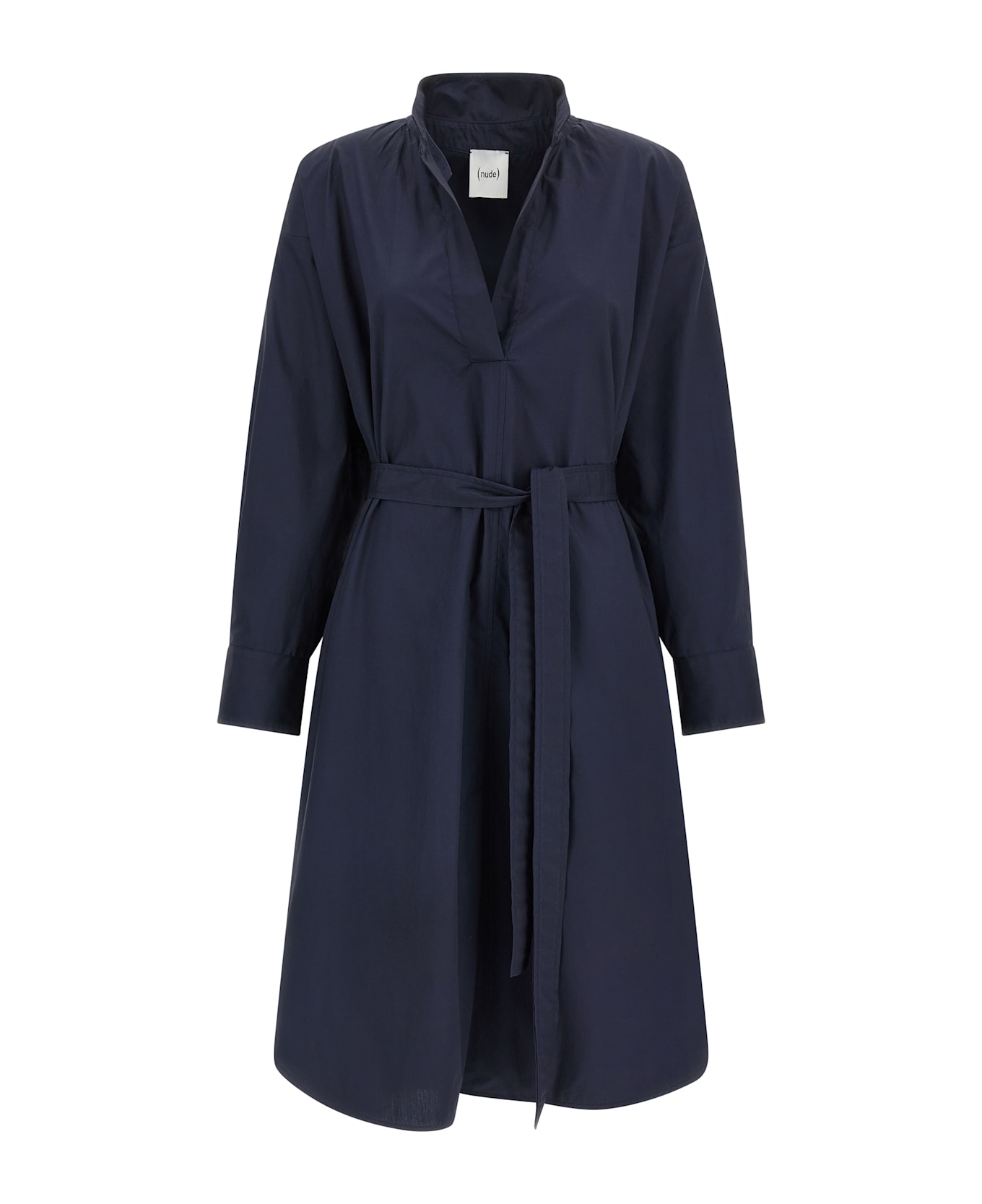 Chemisier midi dress in cotton poplin with open collar, long sleeves with cuffs and dropped shoulder, pockets, front and side slits, rounded hem, and removable matching belt. Composition: 100% cotton
