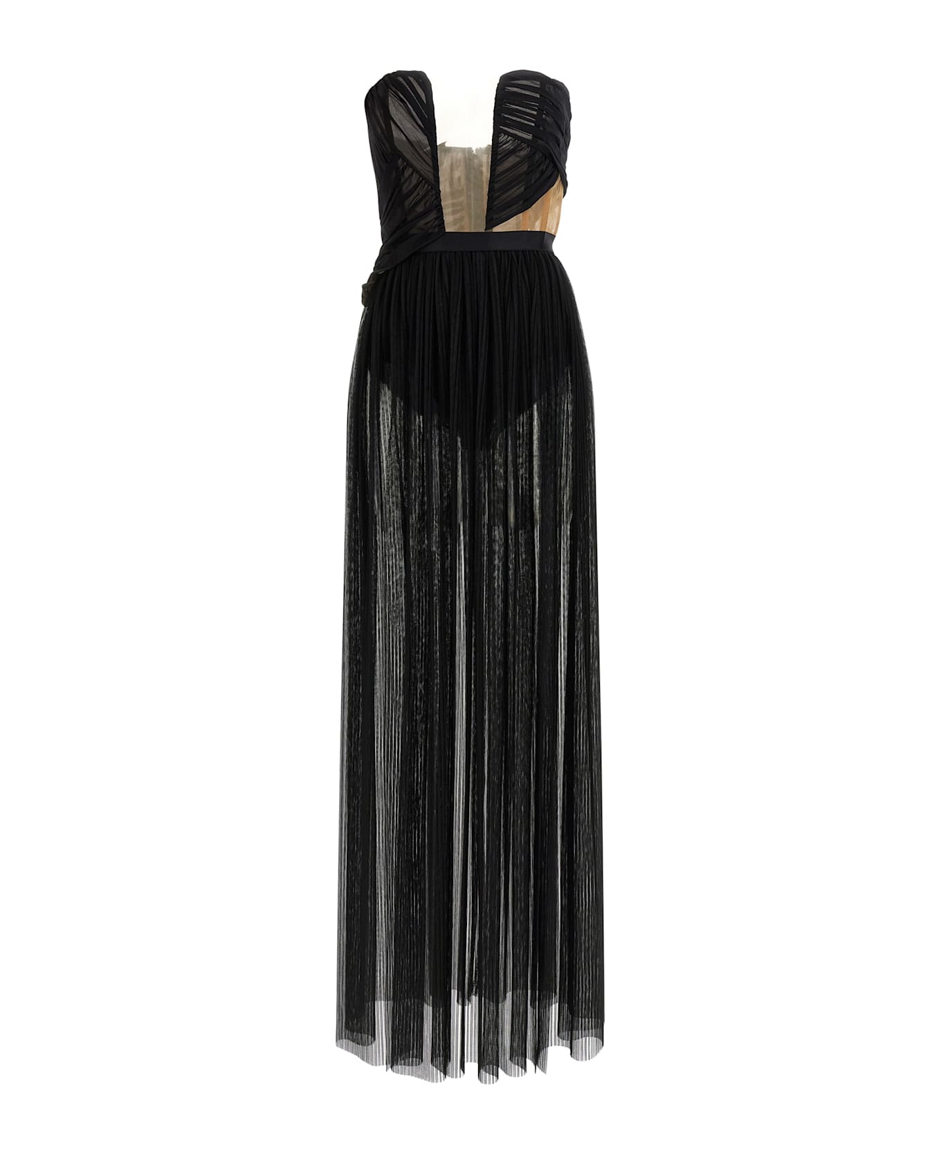 Long 'Corsetto Draped Gown' dress in semi-transparent tulle, off-the-shoulder model with corset upper part structured with splints, pleated skirt with wide front split, back zip closure, sleeveless, inner bodysuit with snap buttons on the hem.