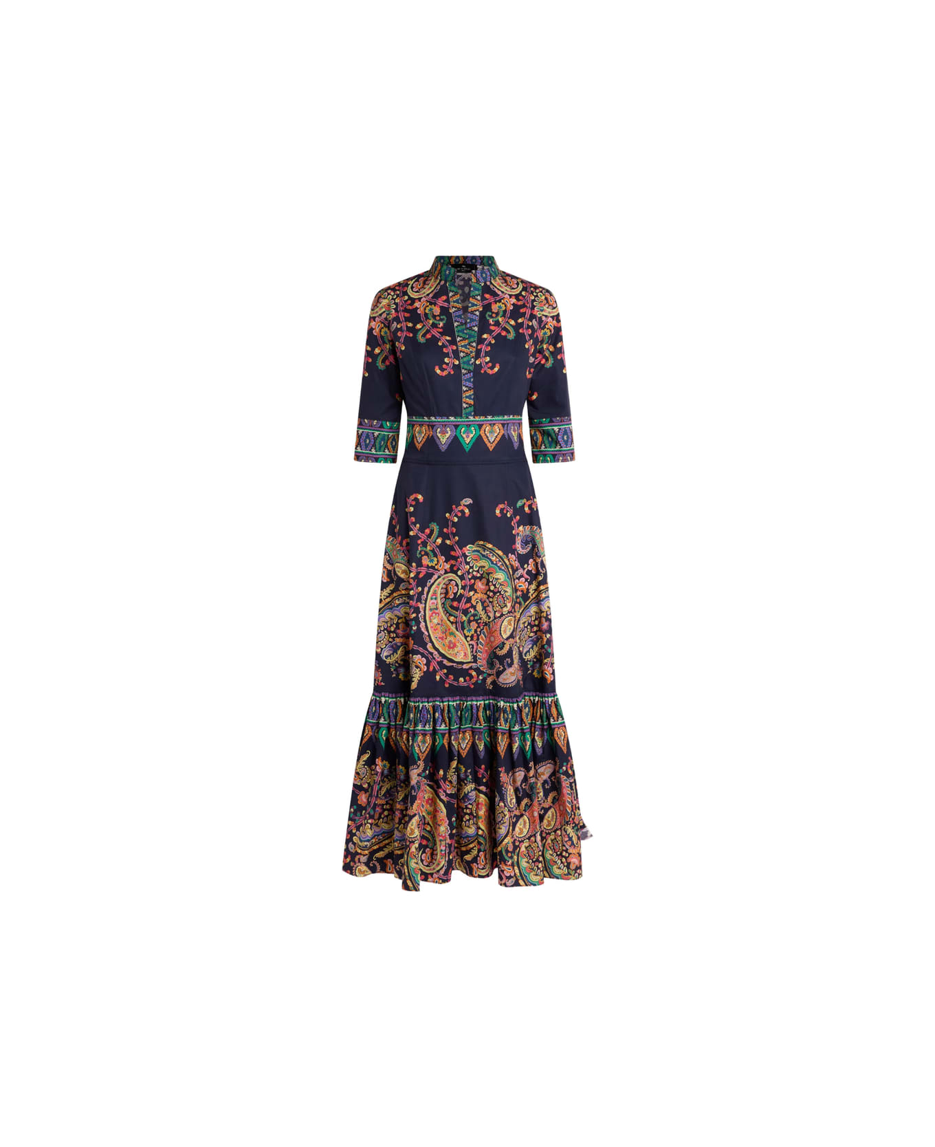 dark blue floral print paisley print three-quarter sleeves mandarin collar tiered skirt