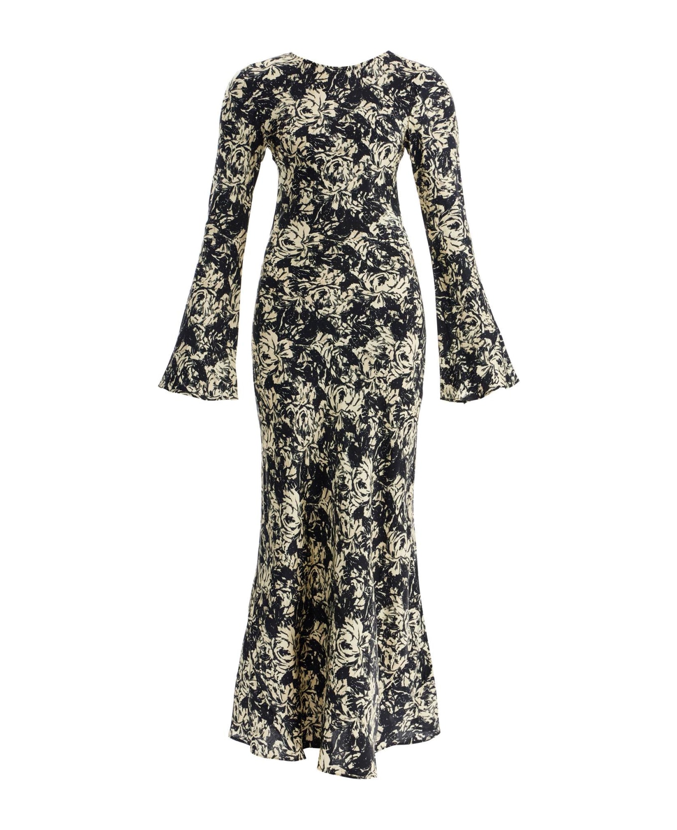 A black and ivory floral print adorns this long Ganni dress, made from stretch recycled viscose satin for a fitted yet comfortable silhouette that flares at the bottom. Framed by a boat neckline, the dress is completed with long bell sleeves. The model is 177 cm tall and wears size EU 34.