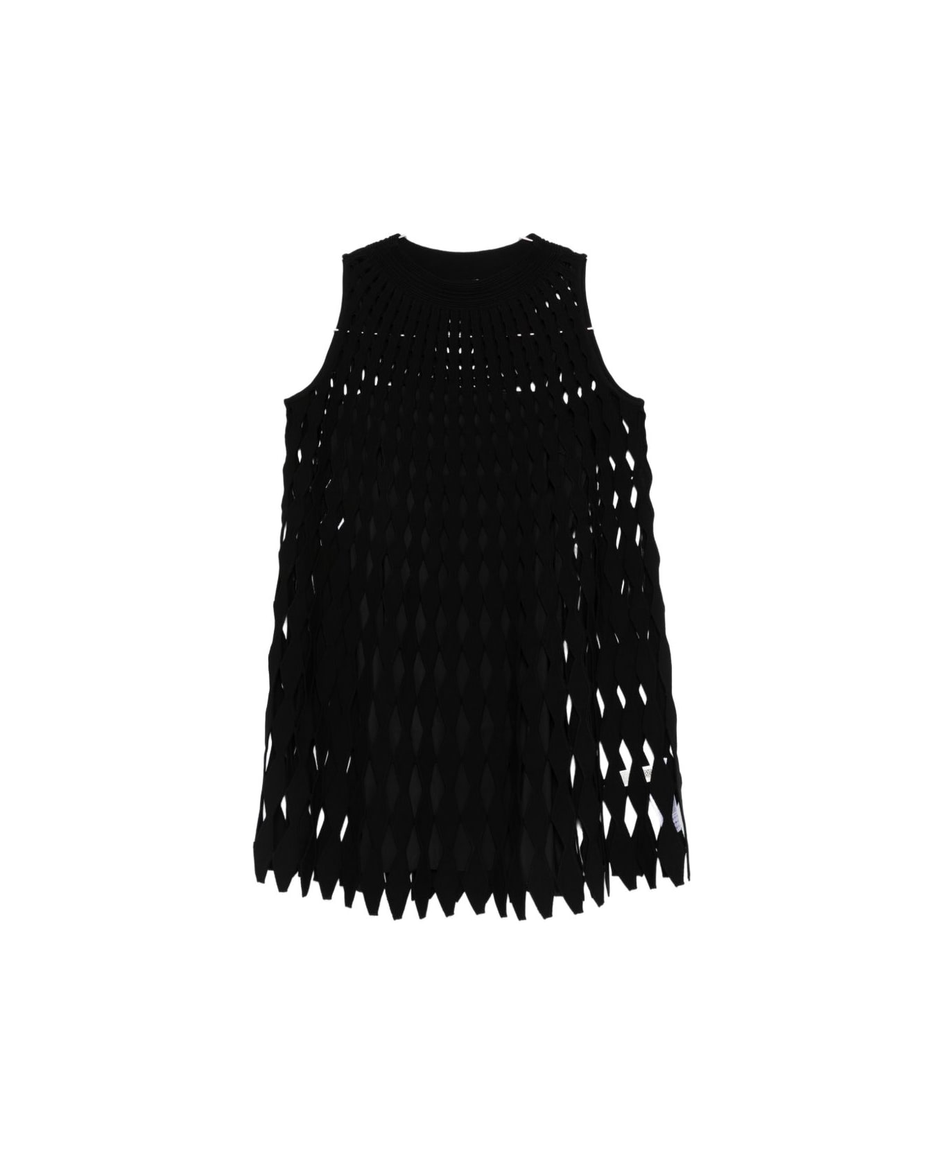 short black dress with diamond-shaped perforations in viscose. Composition: 83% Viscose, 17% Polyester