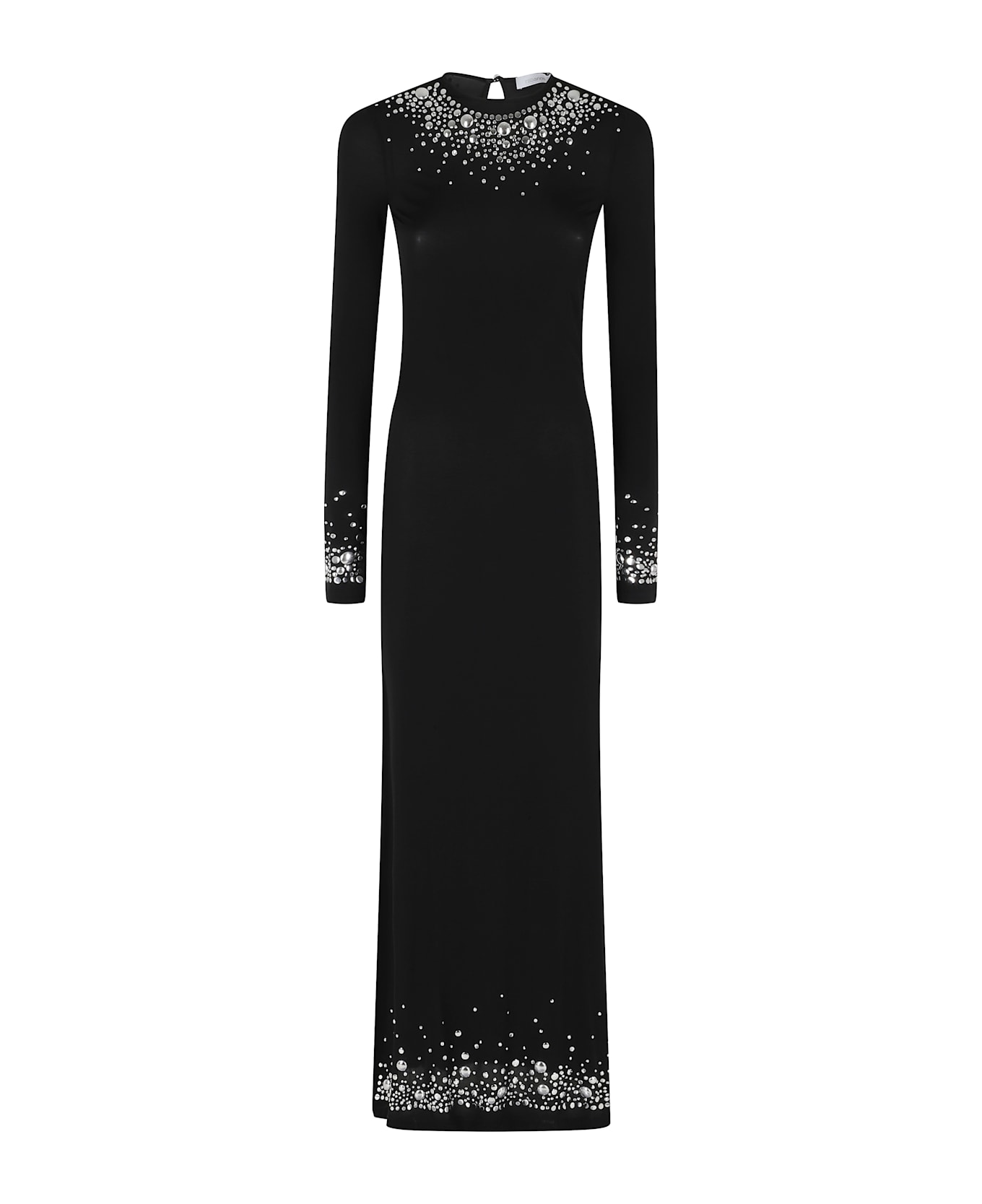 Category: Dress Item: Long hotfix dress Brand: Rabanne Color: Black Collar: Round neck Details: Studded trim SIZE & FIT Fit: Fitted Line: Straight Sleeve Length: Long