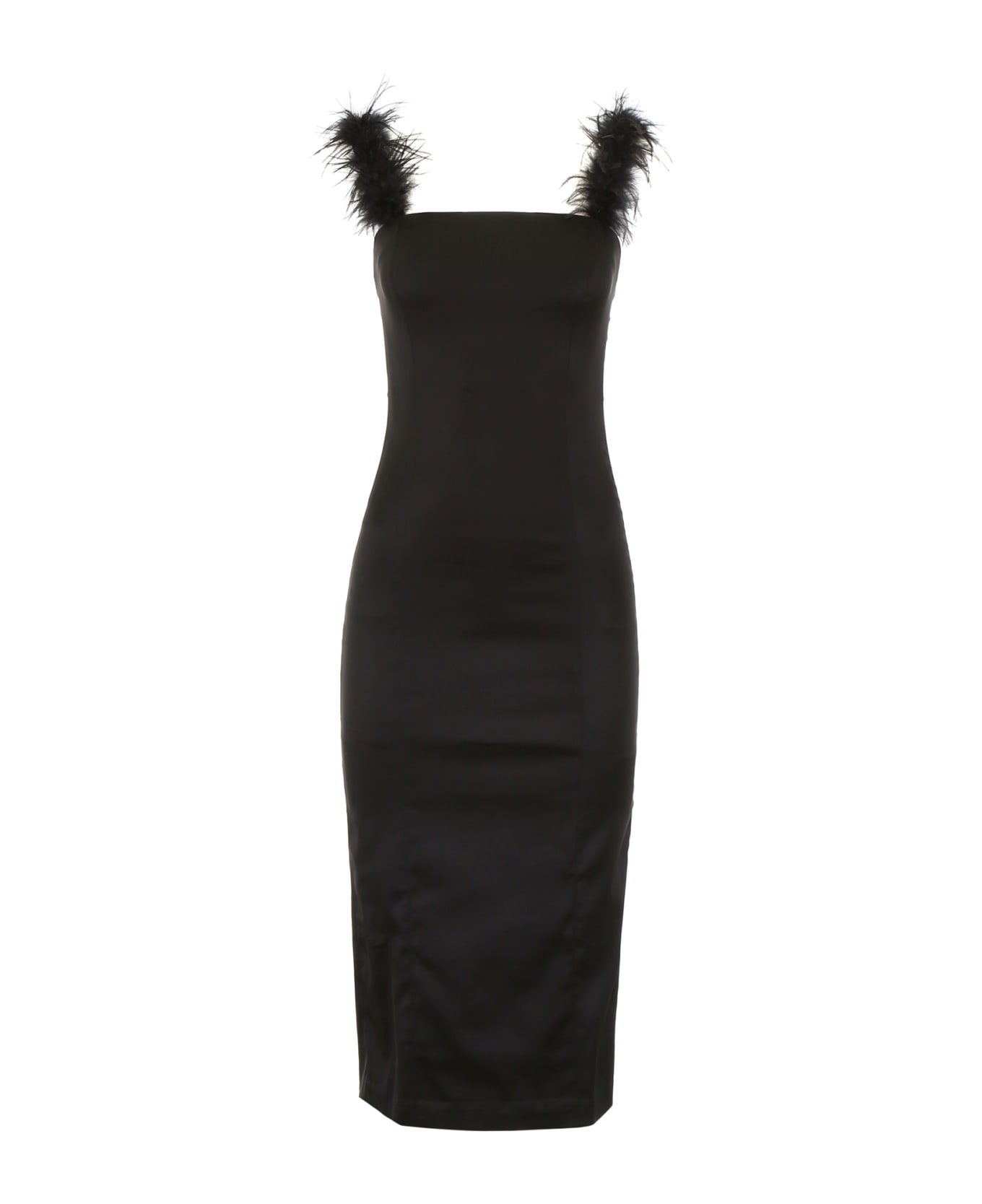 Staud satin dress with ostrich feathers on the shoulder straps. It features concealed back zip closure and central back vent. Unlined. Model height is 177 cm and she is wearing a size US 2.