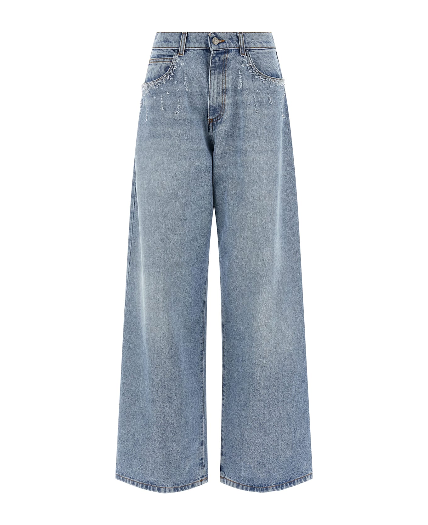 Cotton denim jeans with crystal appliqué on the front, contrast stitching, wide and straight leg, front zip and button closure, five pockets, logo embroidery and leather logo label at the back.