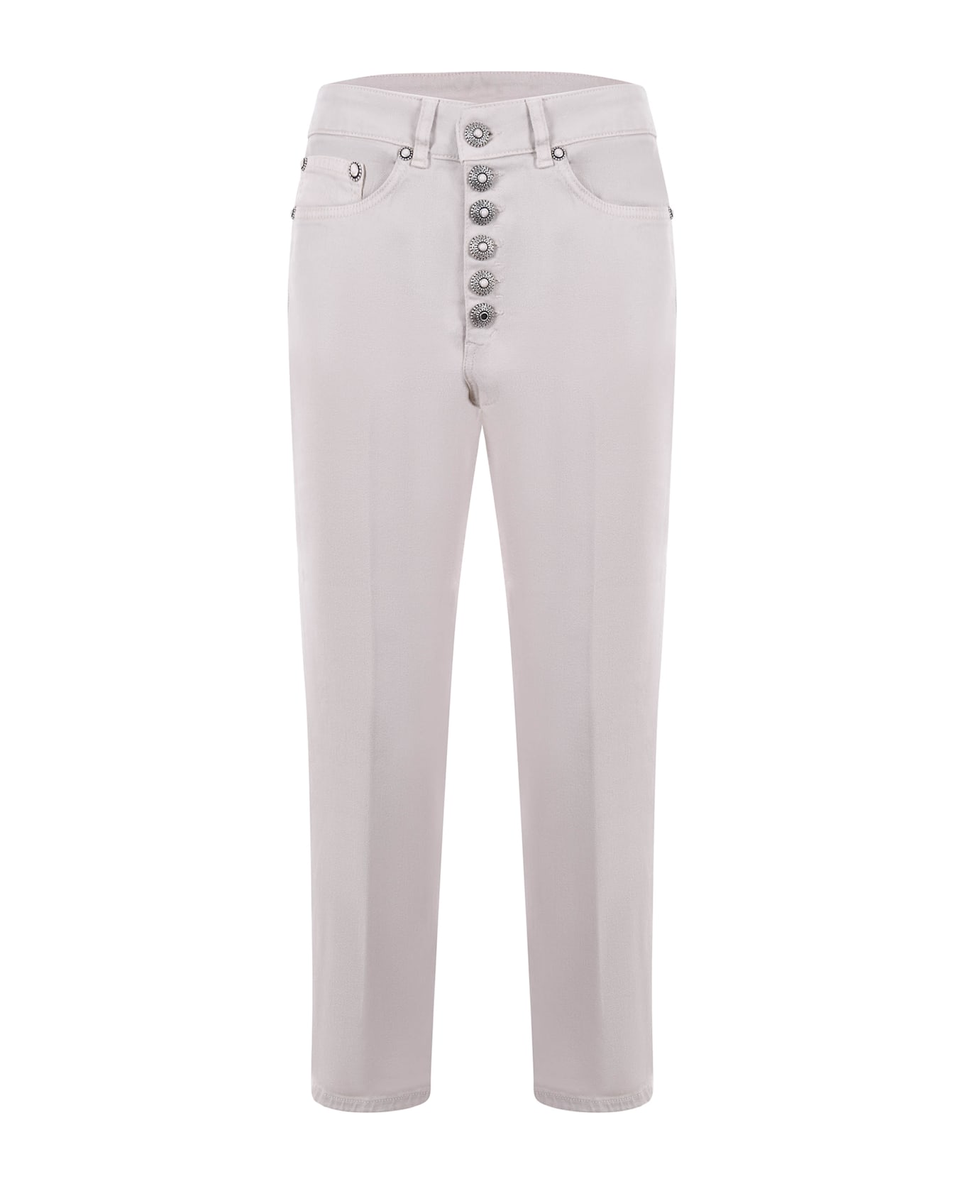 Sand Koons Gioiello jeans by Dondup, in cotton bull, regular waist with belt loops, five-pocket model, logo patch applied on the back, front closure with jewel buttons with white stone in the center, cropped bottom with cuff. Relaxed fit
